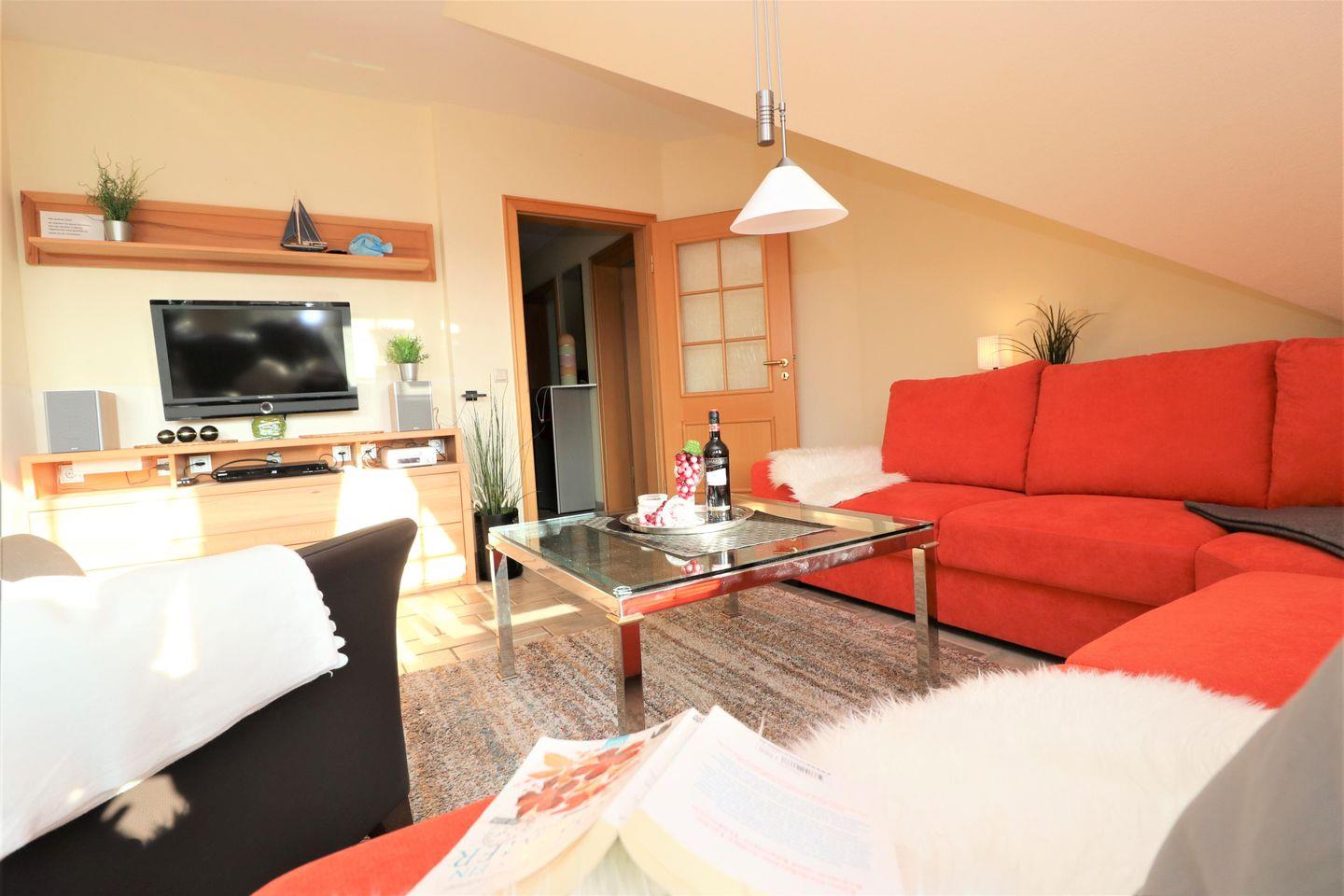 Ein gemütliches Dachgeschoss-Appartement für maximal 4 Personen mit einem Balkon Richtung Süden und Blick auf die Ostsee. Das Appartement verfügt über ein Wohnzimmer mit einer integrierten Küchenzeile, sowie zwei Schlafzimmer mit jeweils einem gemütlichem Doppelbett. Das Badezimmer ist mit einer Dusche/WC, Waschmaschine und einem Trockner ausgestattet. Haustier sind erlaubt, das Rauchen jedoch nicht. Zu diesem Appartement steht Ihnen KEIN WLAN zur Verfügung. Diesem Appartement wird der Tiefgaragenstellplatz Nr. 49 zugeordnet.