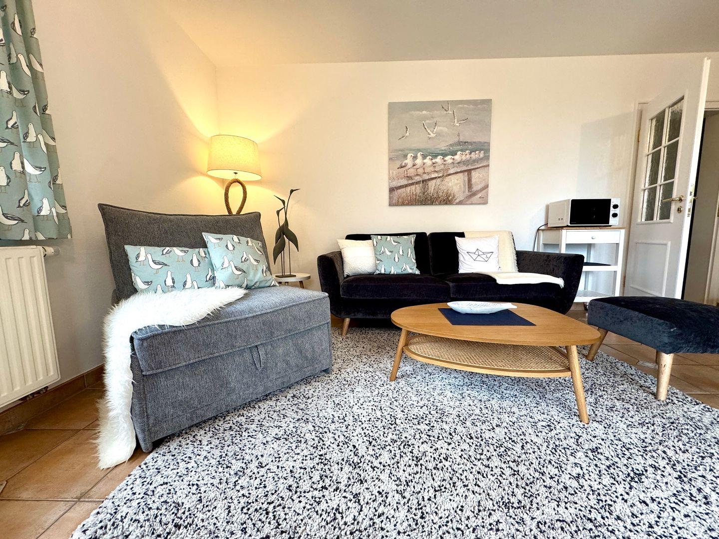 Das 2025 neu renovierte Appartement verfügt über ein Wohnzimmer mit integrierter Küchenzeile und großem, bequemen Schlafsessel.