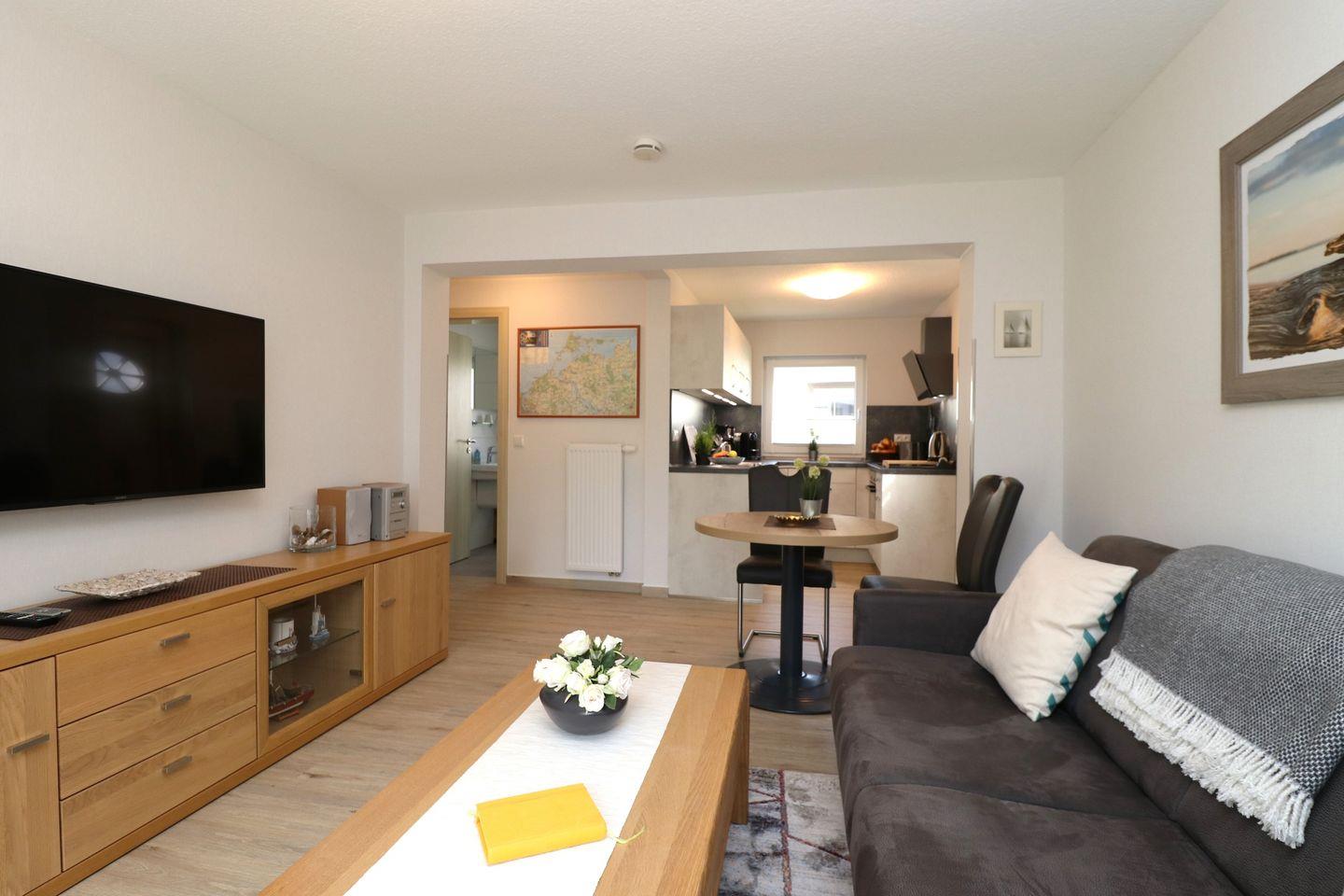 Dieses gemütliche Appartement (ca. 50 m²) bietet Platz für maximal 2 Personen und ist der perfekte Ort für einen entspannten Urlaub zu zweit. Es verfügt über ein Wohnzimmer, das zum Verweilen und Entspannen einlädt, sowie eine Küche, in der Sie Ihre Mahlzeiten zubereiten können. Das Schlafzimmer ist mit einem komfortablen Doppelbett ausgestattet, das für einen erholsamen Schlaf sorgt. Das Bad ist mit einer Dusche und einem WC ausgestattet. Genießen Sie die Terrasse mit Südausrichtung, die Ihnen den ganzen Tag über viel Sonne bietet – ideal für entspannte Stunden im Freien. Ihr PKW-Stellplatz befindet sich direkt auf dem Grundstück, sodass Sie Ihr Fahrzeug bequem abstellen können. Im Appartement steht Ihnen kostenfreies WLAN zur Verfügung, damit Sie problemlos surfen oder mit Ihren Lieben in Kontakt bleiben können. Haustiere sind in diesem Appartement nicht gestattet und Rauchen ist ebenfalls nicht erlaubt, was zu einer angenehmen und gepflegten Atmosphäre beiträgt. Dieses Appartement ist die ideale Wahl für Paare oder Alleinreisende, die eine ruhige und komfortable Unterkunft in schöner Umgebung suchen.