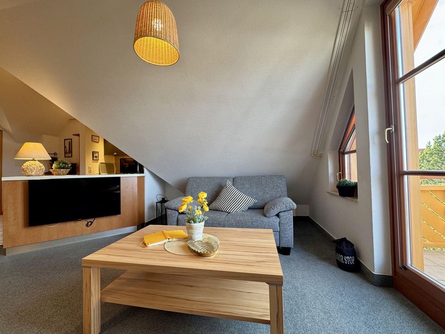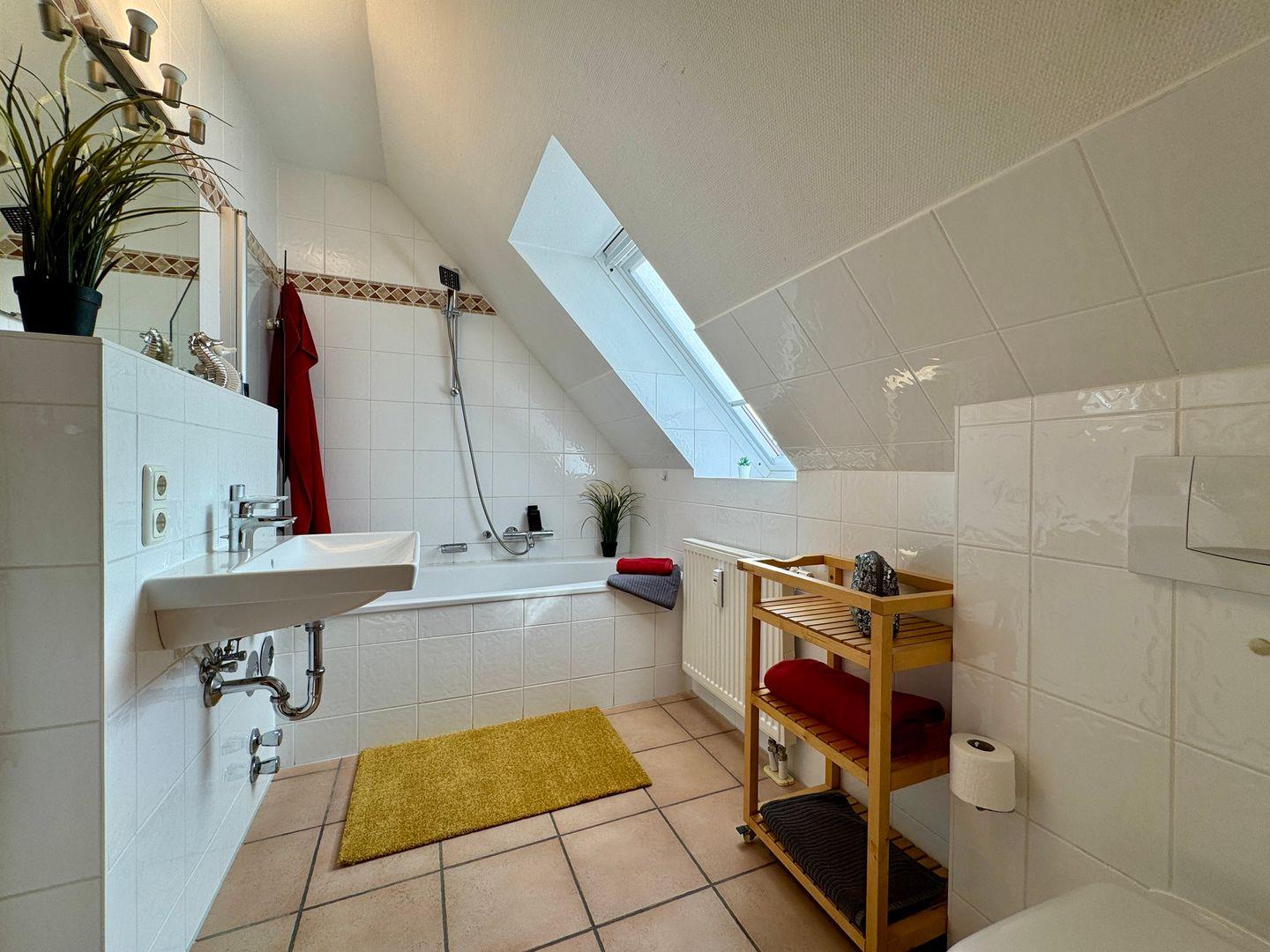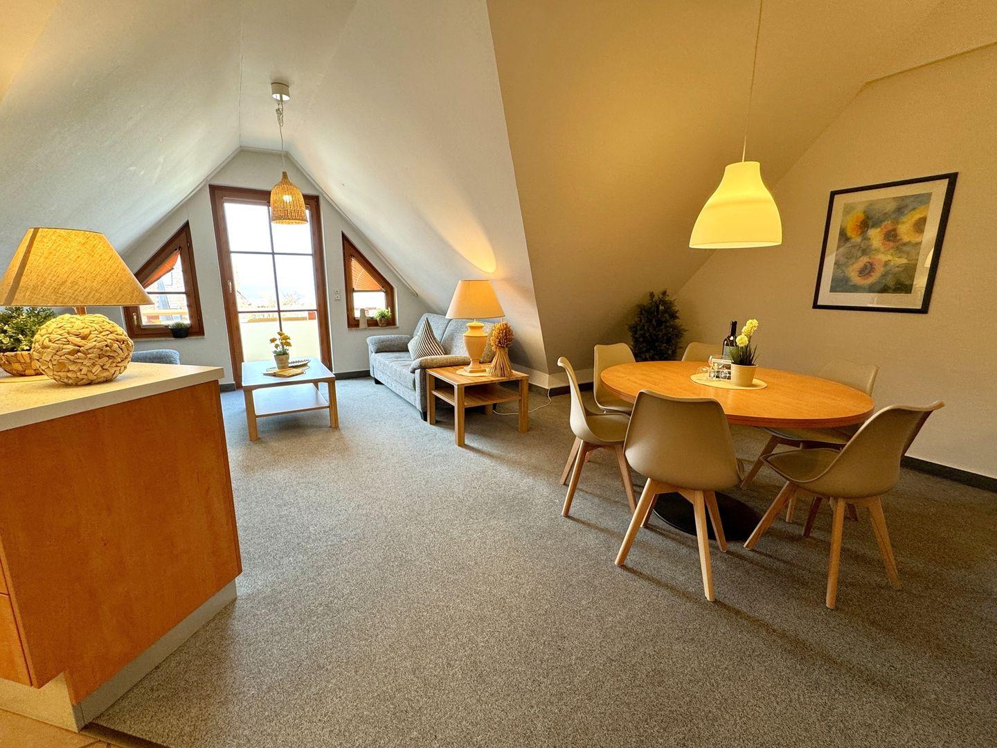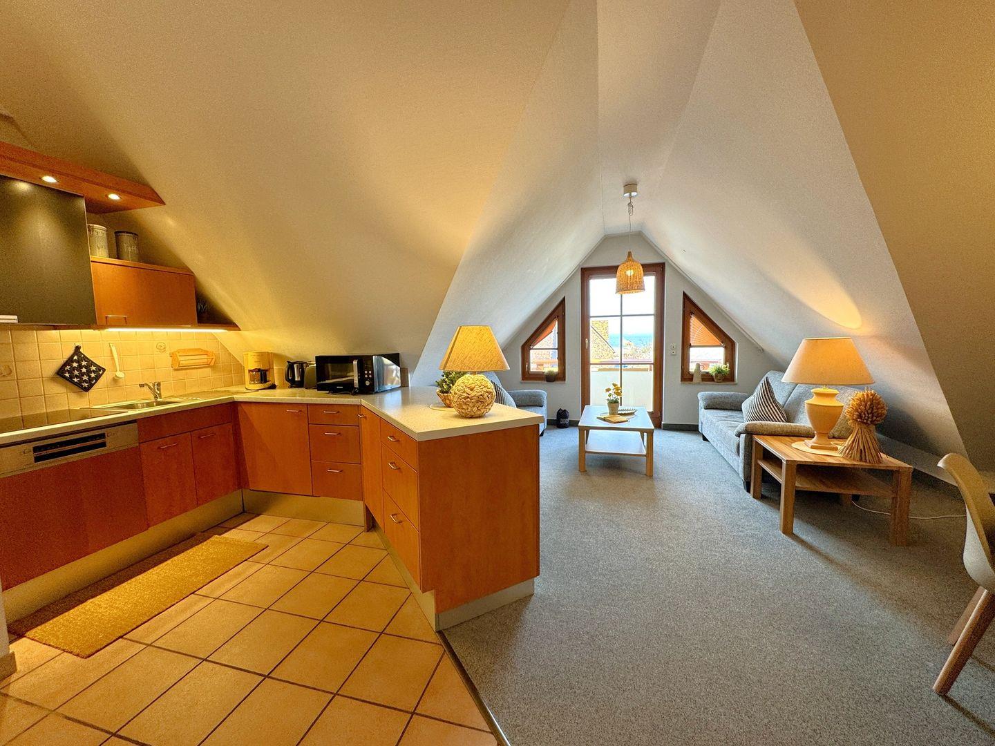 Ein gemütliches Dachgeschoss-Appartement für bis zu 5 Personen mit einem Westbalkon und Ostseeblick. Das Appartement Verfügt über ein Wohnzimmer mit integrierter Küchenzeile, ein Schlafzimmer mit einem Doppelbett und ein weiteres Schlafzimmer mit einem Doppelbett und eine zusätzliche Schlafcouch. Das Badezimmer ist mit einer Badewanne und WC ausgestattet. Haustiere und Rauchen sind nicht gestattet, jedoch gibt es WLAN für einen bequemen Internetzugang während des Aufenthalts. Im Gemeinschaftsraum in der Tiefgarage stehen Waschmaschine und Trockner gegen Gebühr zur Verfügung. Ideal für einen entspannten Aufenthalt! Diesem Appartement ist der Tiefgaragenstellplatz Nr. 09 zugeordnet.