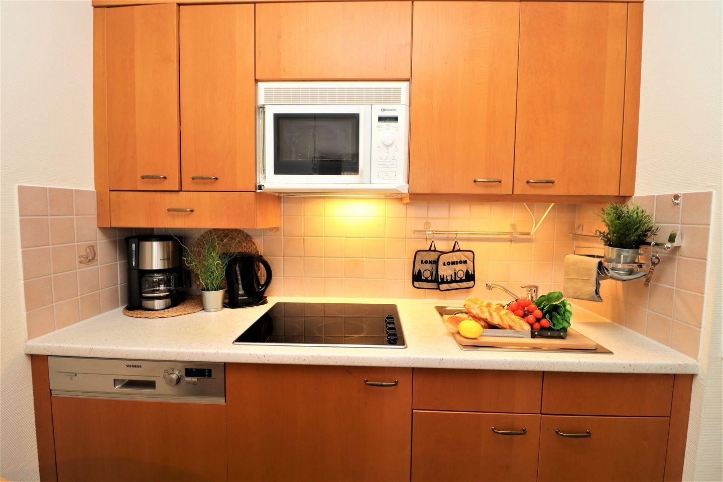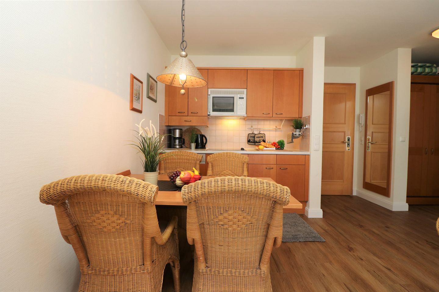 Ein gemütliches Erdgeschoss-Appartement für bis zu 4 Personen mit einer Terrasse nach Süden ausgerichtet. Das Appartement Verfügt über ein Wohnzimmer mit Schlafcouch und integrierter Küchenzeile und ein Schlafzimmer mit einem gemütlichem Doppelbett, für erholsamen Schlaf. Das Badezimmer ist mit einer Badewanne und WC ausgestattet. Haustiere und Rauchen sind nicht gestattet, jedoch gibt es WLAN für einen bequemen Internetzugang während des Aufenthalts. Im Gemeinschaftsraum in der Tiefgarage stehen Waschmaschine und Trockner gegen Gebühr zur Verfügung. Ideal für einen entspannten Aufenthalt! Diesem Appartement ist der Tiefgaragenstellplatz Nr. 27 zugeordnet.