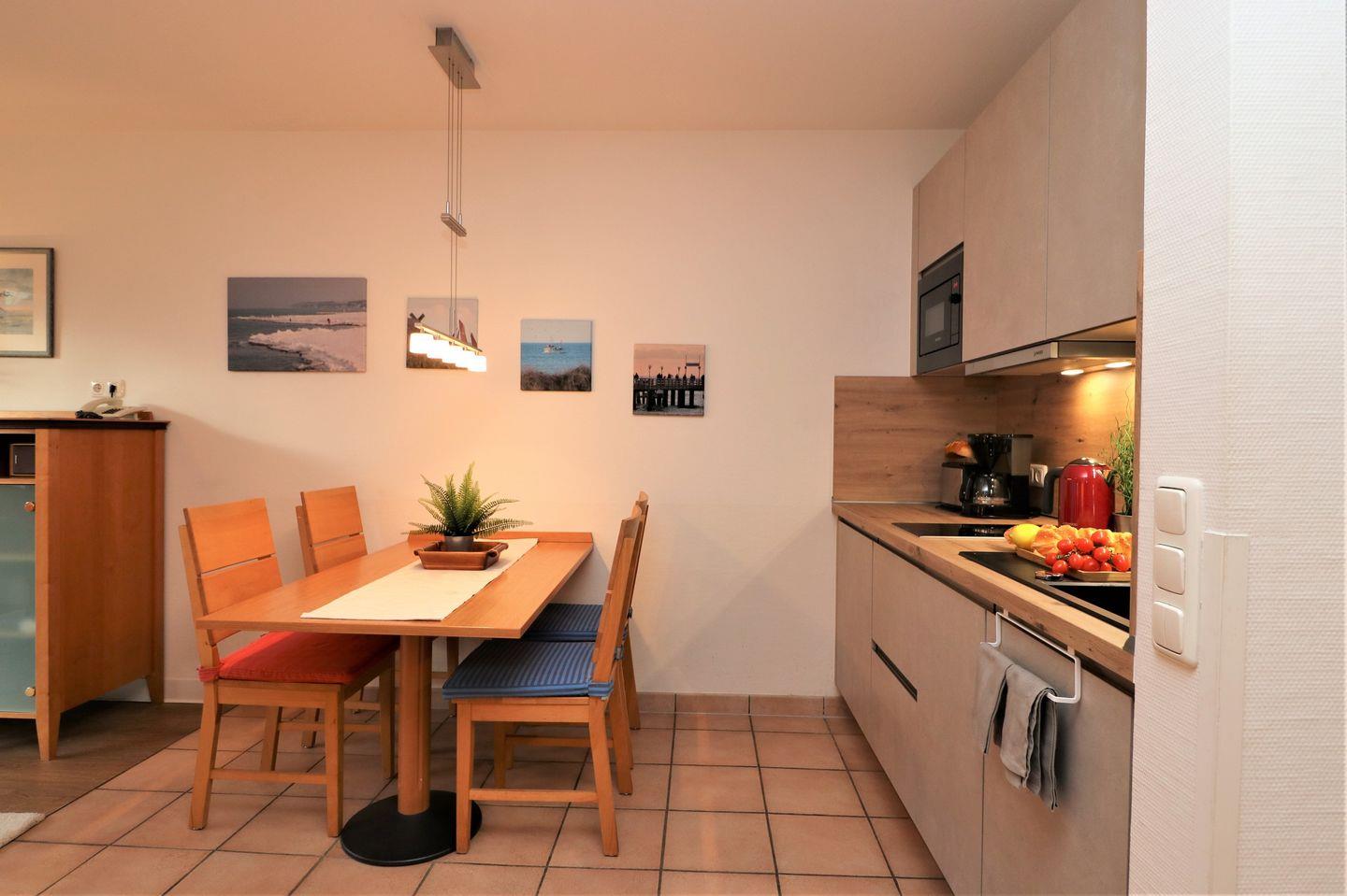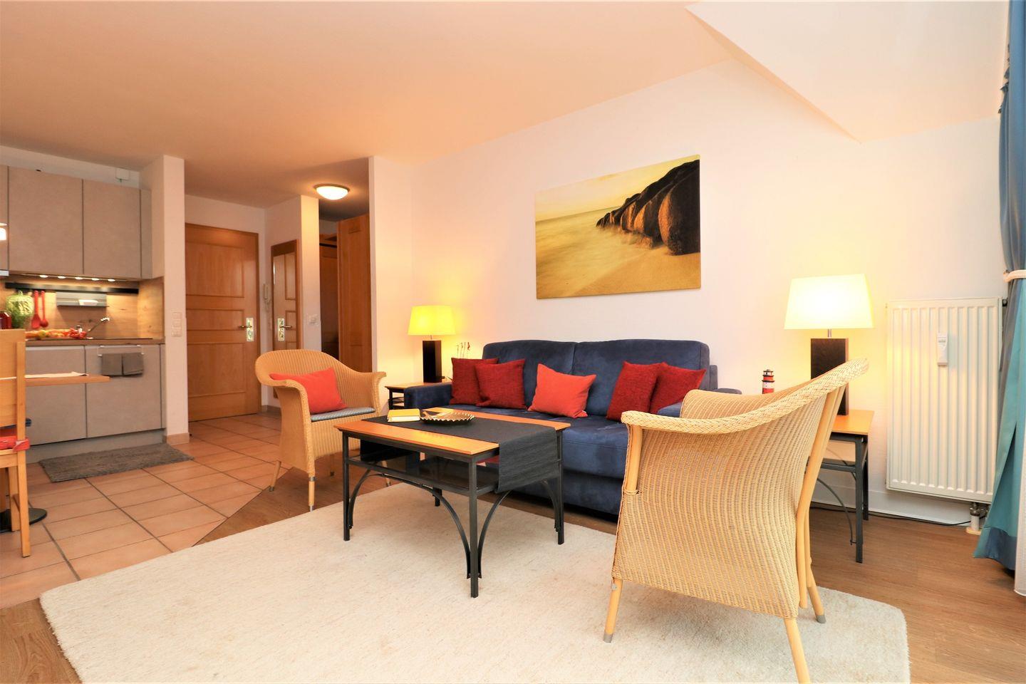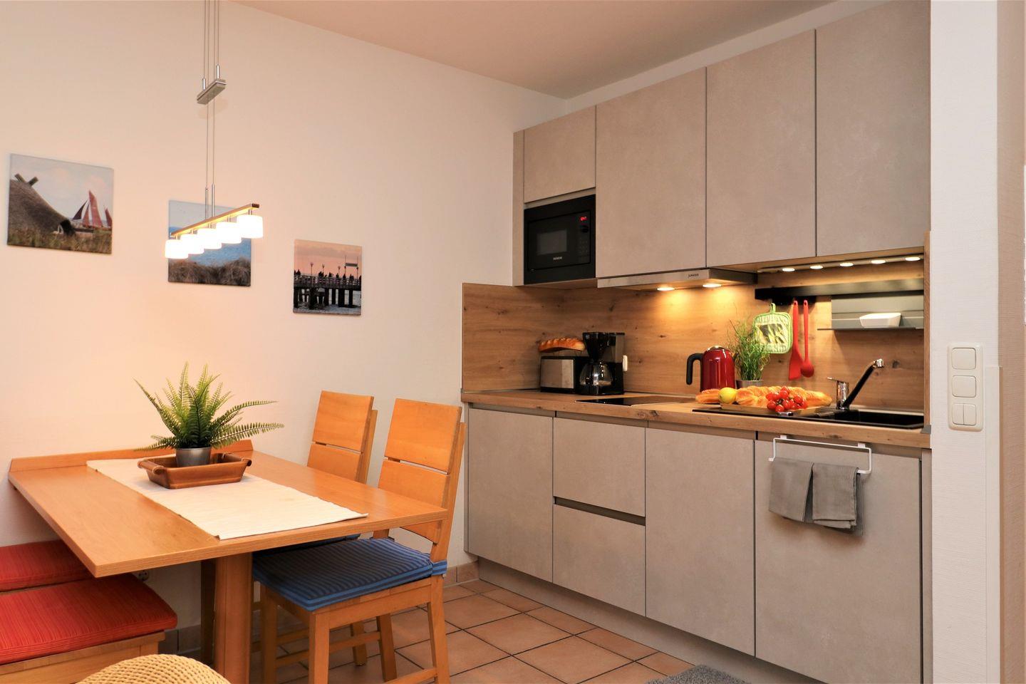 Ein charmantes Appartement im Obergeschoss für maximal 2 Personen mit einem Südbalkon und eingeschränktem Ostseeblick. Das Appartement Verfügt über ein Wohnzimmer mit integrierter Küchenzeile und ein Schlafzimmer mit einem gemütlichem Doppelbett, für erholsamen Schlaf. Das Badezimmer ist mit einer Dusche und WC ausgestattet. Haustiere sind erlaubt, jedoch ist das Rauchen nicht gestattet. WLAN ist verfügbar, um Ihren Aufenthalt zu vervollständigen. Im Gemeinschaftsraum in der Tiefgarage stehen Waschmaschine und Trockner gegen Gebühr zur Verfügung. Ideal für einen entspannten Aufenthalt! Diesem Appartement ist der Tiefgaragenstellplatz Nr. 33 zugeordnet.