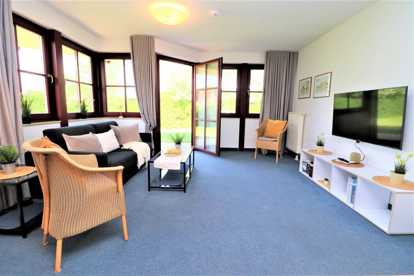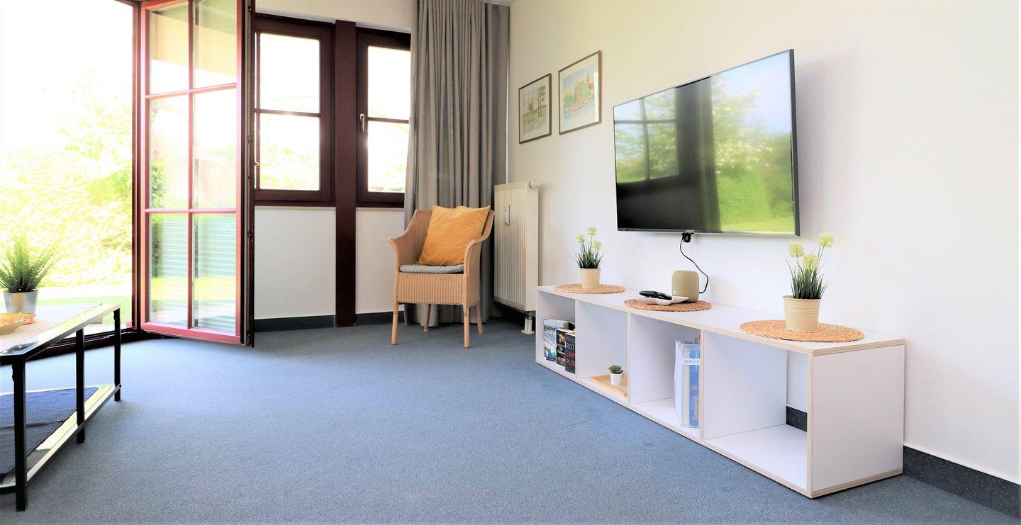 Ein gemütliches Erdgeschoss-Appartement für bis zu 4 Personen mit einer Terrasse nach Westen ausgerichtet. Das Appartement Verfügt über ein Wohnzimmer mit Schlafcouch und integrierter Küchenzeile und ein Schlafzimmer mit einem gemütlichem Doppelbett, für erholsamen Schlaf. Das Badezimmer ist mit einer Badewanne und WC ausgestattet. Haustiere und Rauchen sind nicht gestattet, jedoch gibt es WLAN für einen bequemen Internetzugang während des Aufenthalts. Im Gemeinschaftsraum in der Tiefgarage stehen Waschmaschine und Trockner gegen Gebühr zur Verfügung. Ideal für einen entspannten Aufenthalt! Diesem Appartement ist einem Tiefgaragenstellplatz Nr. 49 zugeordnet.