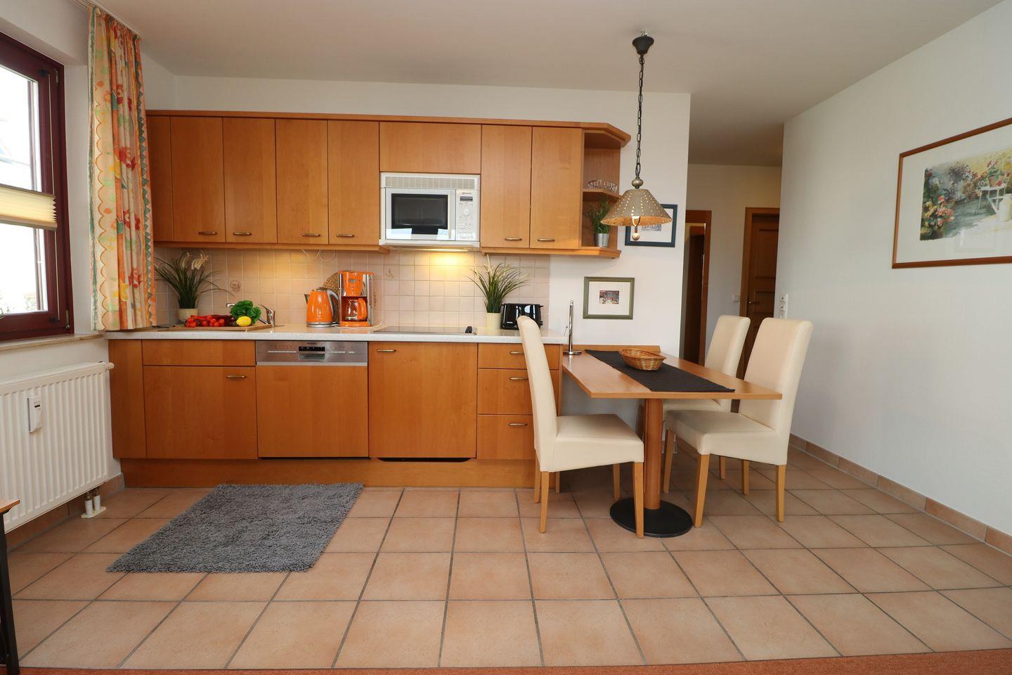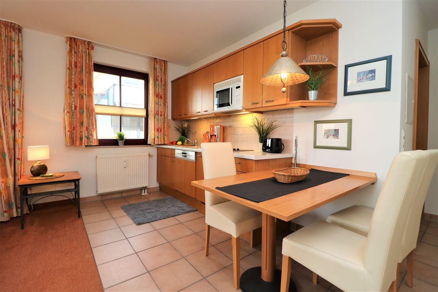 Ein gemütliches Erdgeschoss-Appartement für bis zu 2 Personen mit einer Terrasse nach Westen ausgerichtet. Das Appartement Verfügt über ein Wohnzimmer mit integrierter Küchenzeile und ein Schlafzimmer mit einem gemütlichem Doppelbett, für erholsamen Schlaf. Das Badezimmer ist mit einer Badewanne und WC ausgestattet. Haustiere und Rauchen sind nicht gestattet, jedoch steht Ihnen WLAN zur Verfügung. Im Gemeinschaftsraum in der Tiefgarage stehen Waschmaschine und Trockner gegen Gebühr zur Verfügung. Ideal für einen entspannten Aufenthalt! Diesem Appartement ist einem Tiefgaragenstellplatz Nr. 51 zugeordnet.