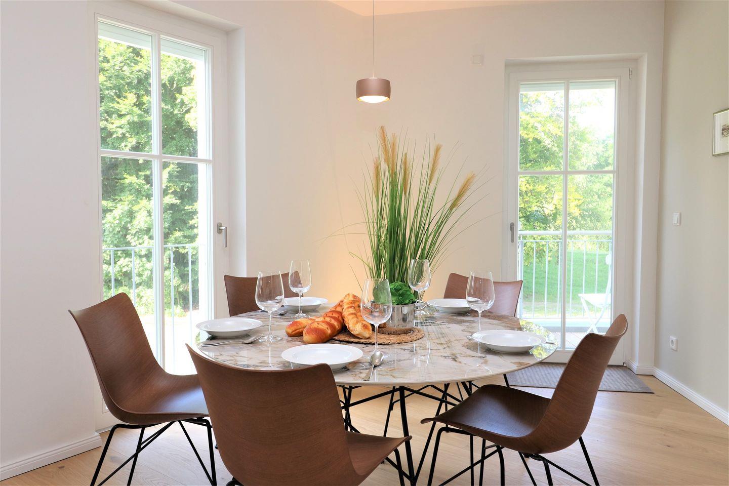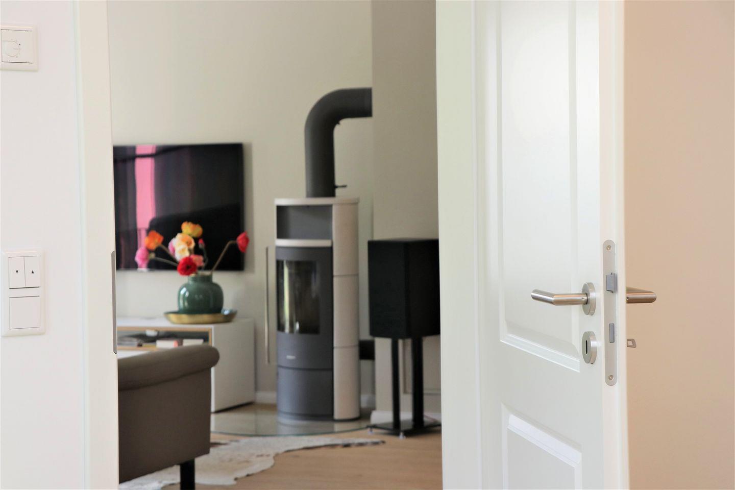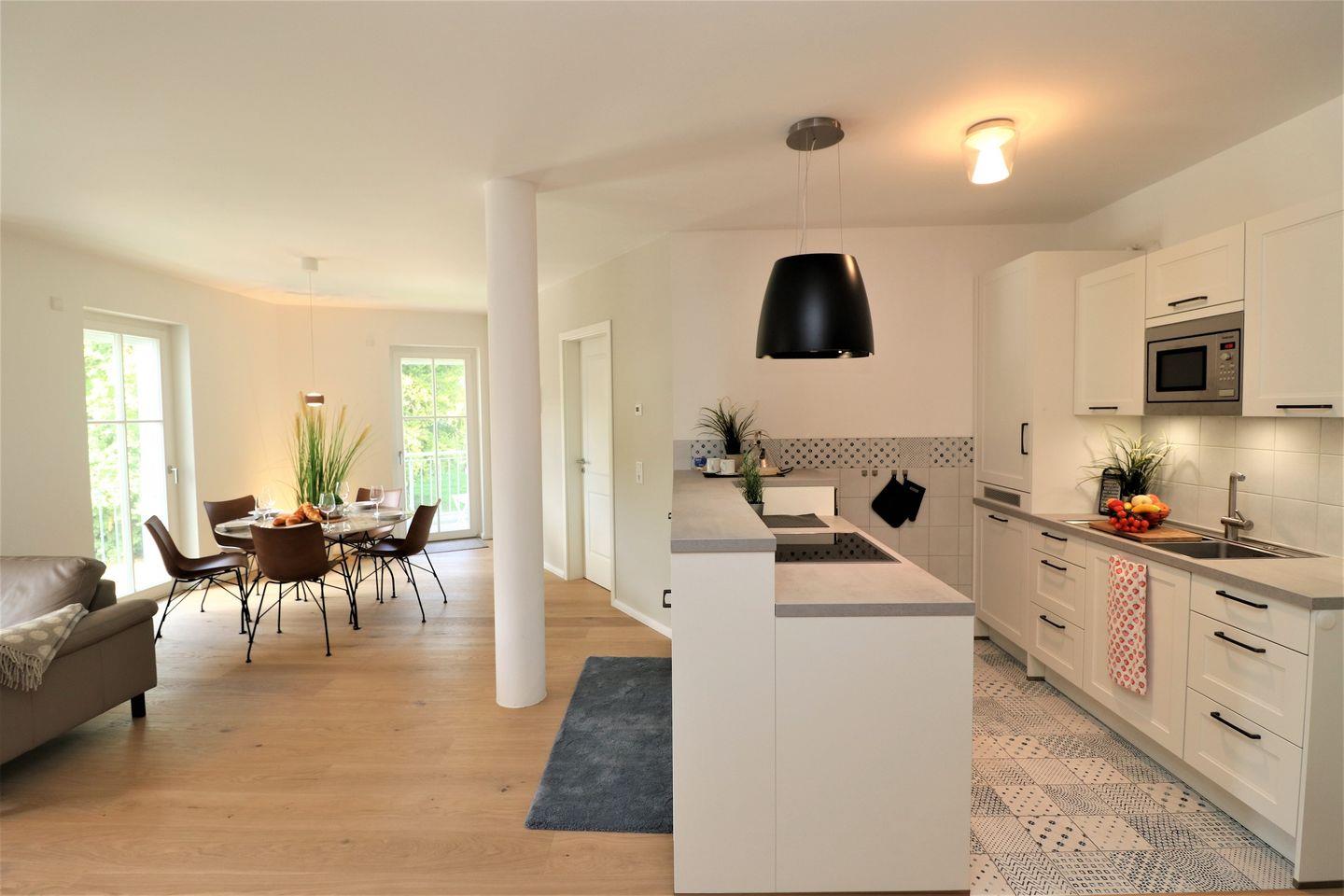 Die lichtdurchfluteten Räume der Wohnung sind liebevoll eingerichtet und schaffen eine einladende Atmosphäre. Über den Aufzug gelangen Sie bequem in die erste Etage, wo sich die hochwertigen Wohnbereiche befinden. Das offene Wohnkonzept verbindet den gemütlichen Wohnbereich mit der modernen Küche, die mit sämtlichen Annehmlichkeiten ausgestattet ist, darunter ein Geschirrspüler, ein Ceran-Herd, ein Backofen und eine Mikrowelle. Gemeinsame Essen am Esstisch werden hier zum Erlebnis – genießen Sie die gesunde Ostseeluft und die Nähe zur Natur!