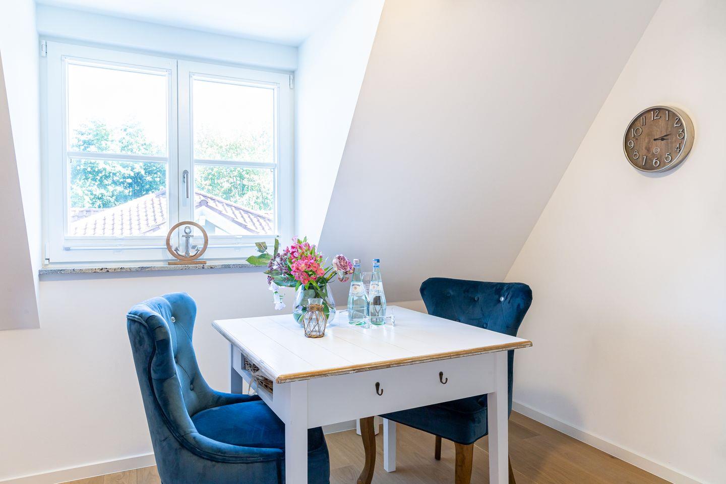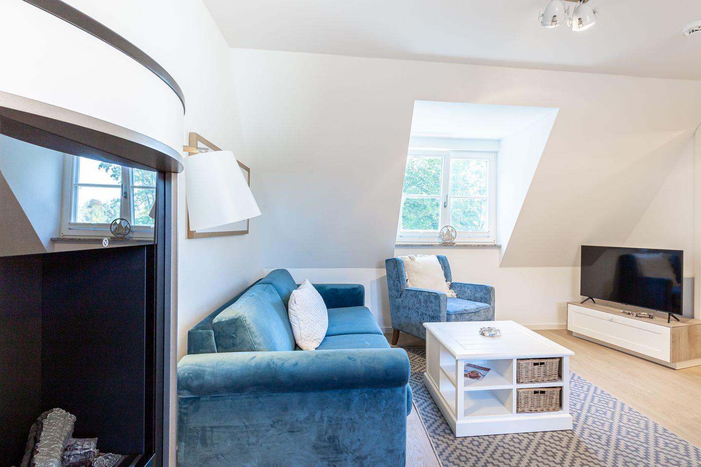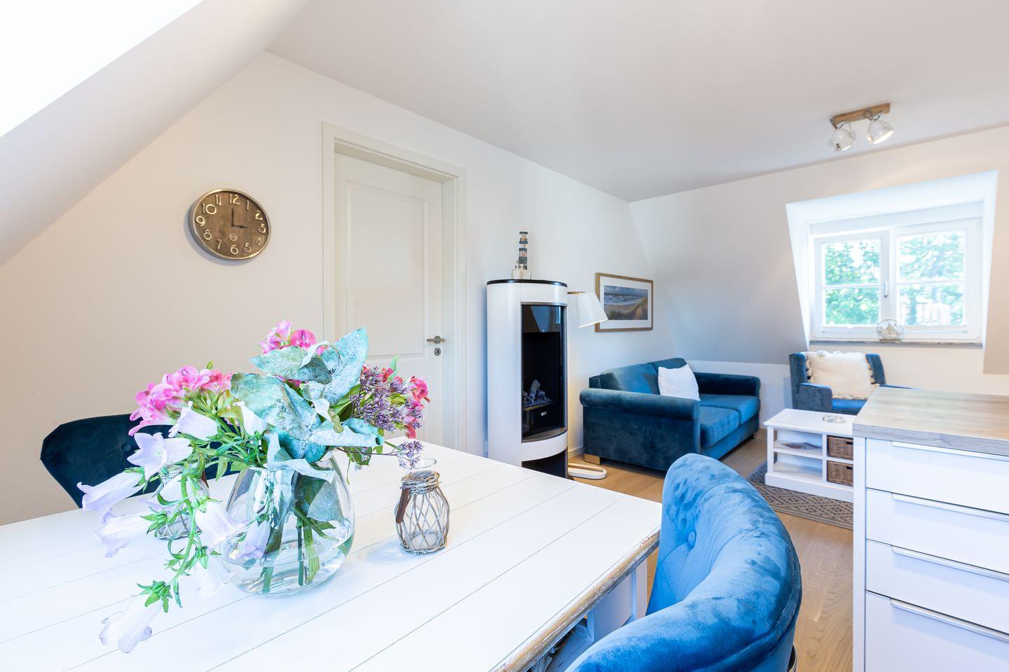 Parkliebe 7 befindet sich im zweiten Obergeschoss des Apartmenthauses und ist über eine Treppe zu erreichen. Der Seaside-Stil passt perfekt zu der strandnahen Umgebung und findet sich als Einrichtungsstil in der gesamten Wohnung wieder. Herzstück der Ferienunterkunft ist der Wohn- und Küchenbereich. Auf der einen Seite lässt es sich mit Sofa, Sessel und TV gemütlich machen. Auf der anderen Seite befindet sich die vollausgestattete Küchenzeile mit Esstisch am Fenster. Hier lässt es sich nach Herzenslust kochen, klönen und entspannen. Ebenso liebevoll wie der Wohnraum ist auch das Schlafzimmer eingerichtet. Das hochwertige Boxspringbett und die großen Dachfenster mit Blick ins Grüne schaffen eine heimelige Atmosphäre und den perfekten Rückzugsort. Abgerundet wird der Wohnkomfort mit einem Tageslichtbad, bodengleicher Dusche und Fön.