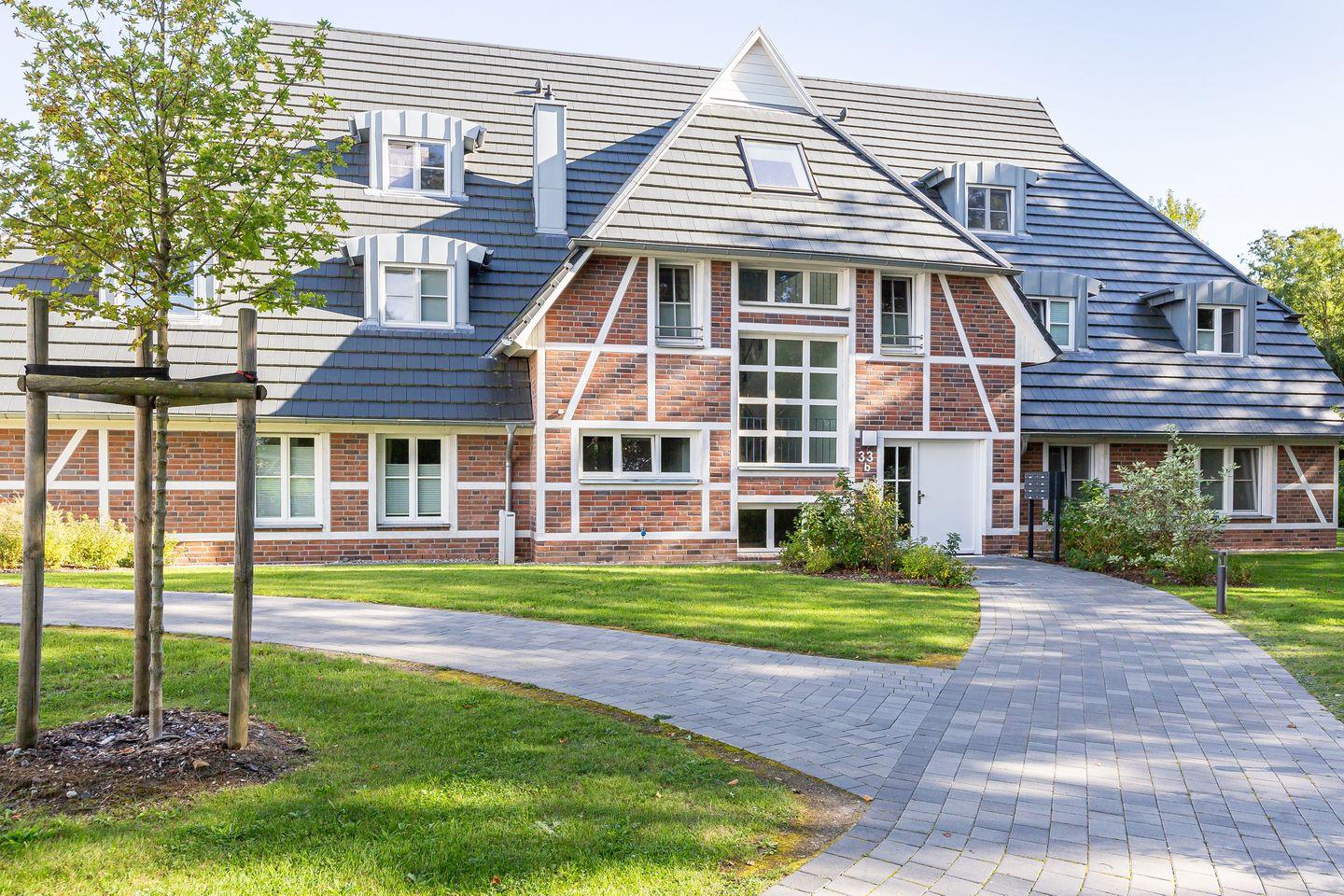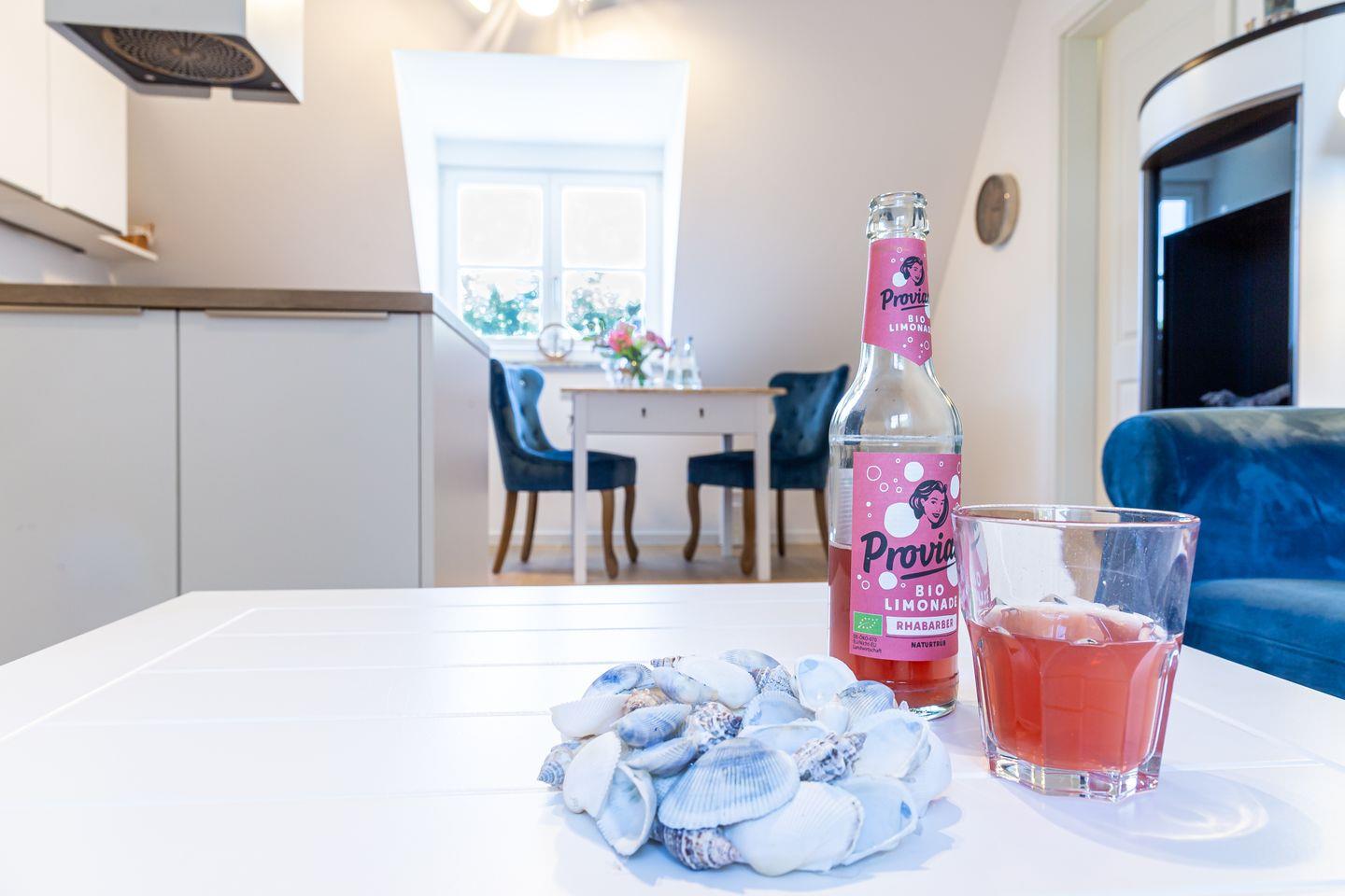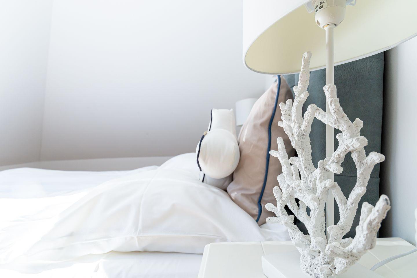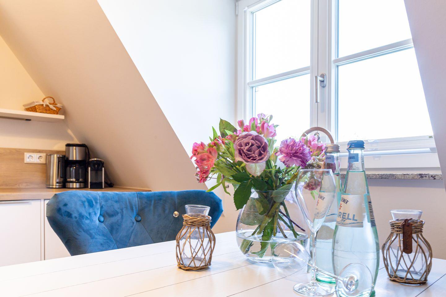Parkliebe 7 befindet sich im zweiten Obergeschoss des Apartmenthauses und ist über eine Treppe zu erreichen. Der Seaside-Stil passt perfekt zu der strandnahen Umgebung und findet sich als Einrichtungsstil in der gesamten Wohnung wieder. Herzstück der Ferienunterkunft ist der Wohn- und Küchenbereich. Auf der einen Seite lässt es sich mit Sofa, Sessel und TV gemütlich machen. Auf der anderen Seite befindet sich die vollausgestattete Küchenzeile mit Esstisch am Fenster. Hier lässt es sich nach Herzenslust kochen, klönen und entspannen. Ebenso liebevoll wie der Wohnraum ist auch das Schlafzimmer eingerichtet. Das hochwertige Boxspringbett und die großen Dachfenster mit Blick ins Grüne schaffen eine heimelige Atmosphäre und den perfekten Rückzugsort. Abgerundet wird der Wohnkomfort mit einem Tageslichtbad, bodengleicher Dusche und Fön.