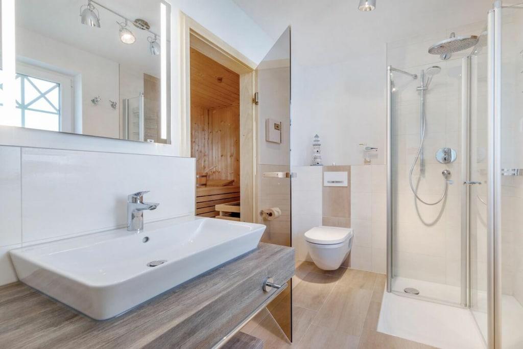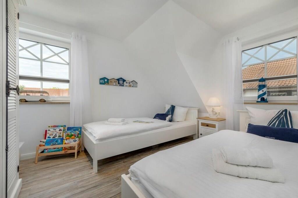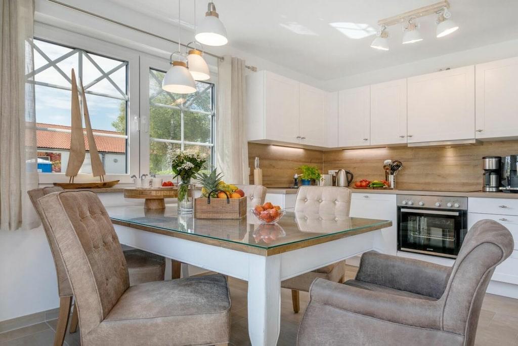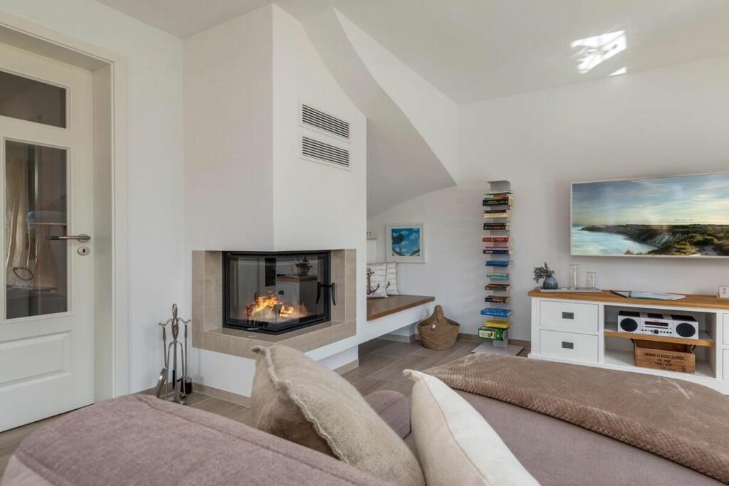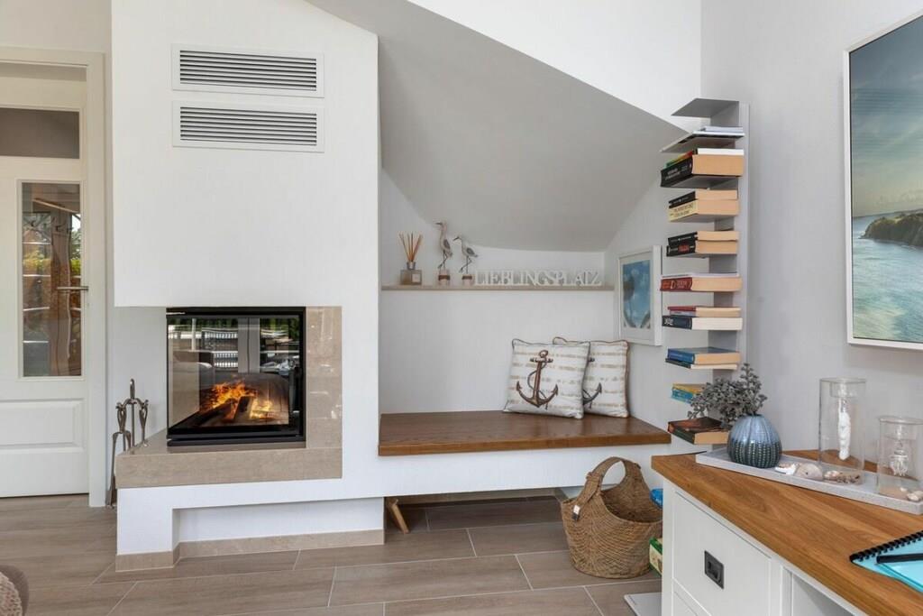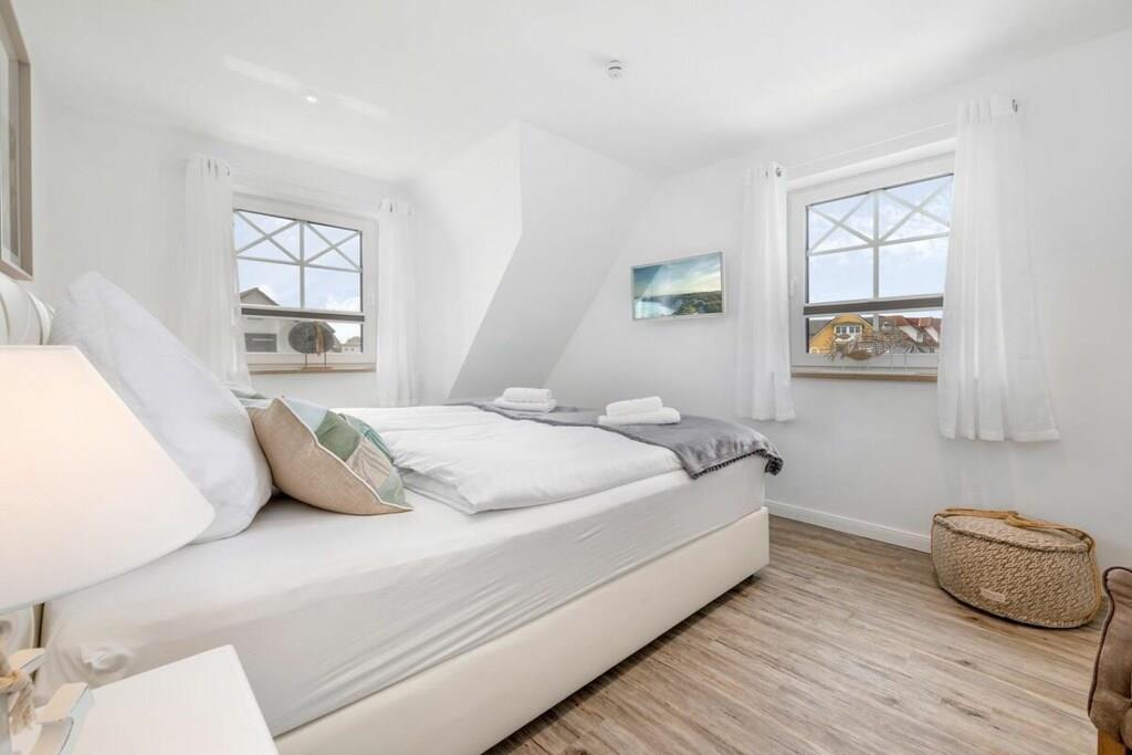 Der lichtdurchflutete Wohnbereich verfügt über eine offene Küche, einen Essbereich für bis zu 8 Personen und einer gemütlichen Couch. Das Haus verfügt über 4 Schlafzimmer und bietet somit Platz für bis zu 8 Personen. Zwei Schlafzimmer befinden sich im Obergeschoß des Ferienhauses und laden mit Boxspringbetten zum Ausschlafen ein. Ein weiteres Schlafzimmer im Obergeschoß ist mit 2 Einzelbetten ausgestattet. Der Dachboden im Darßer Stil, mit einem wunderschönen Panoramafenster, ist als weiteres Schlafzimmer ausgebaut und verfügt über eine Doppelbettschlafcouch.Die hauseigene Sauna (mit Münzautomat), im Badezimmer des Erdgeschosses, macht den Ostseeurlaub gerade in den kühleren Monaten zu einem echten Wohlfühlurlaub.