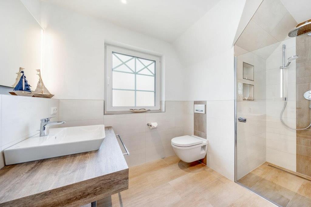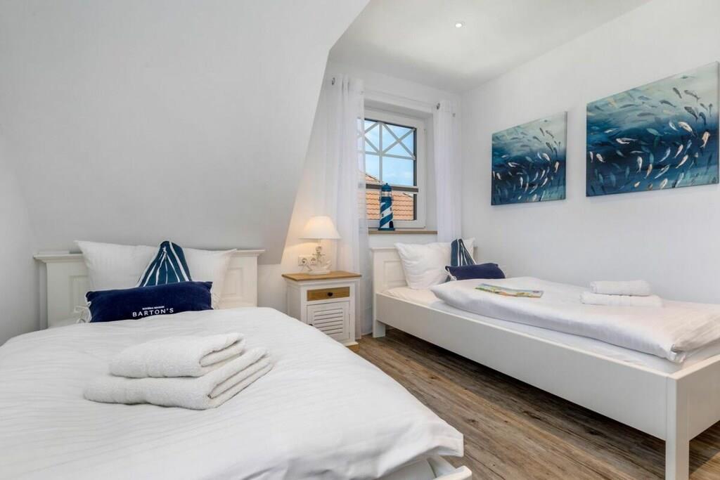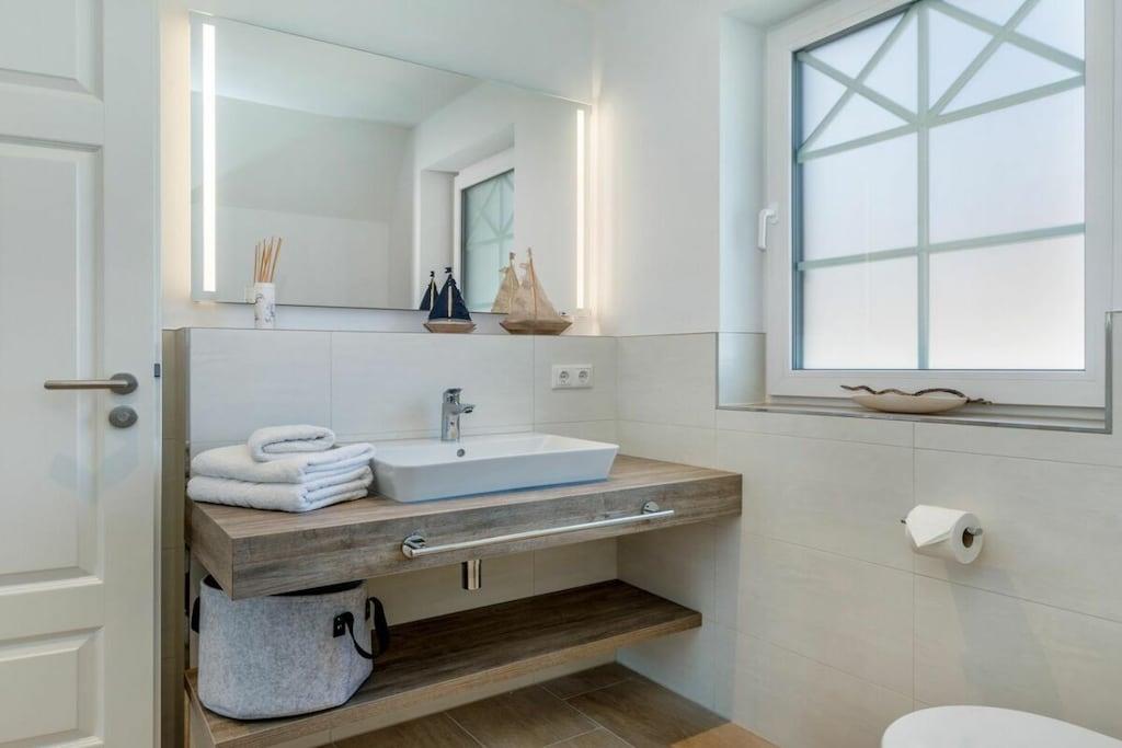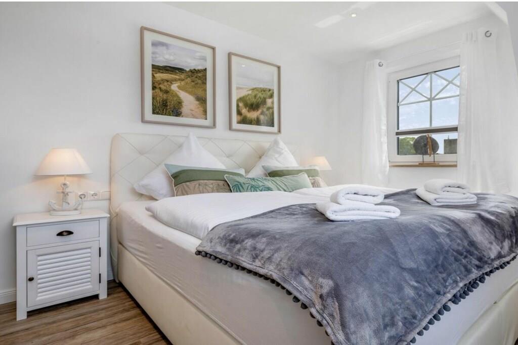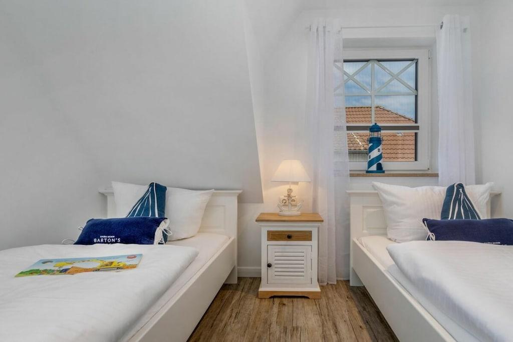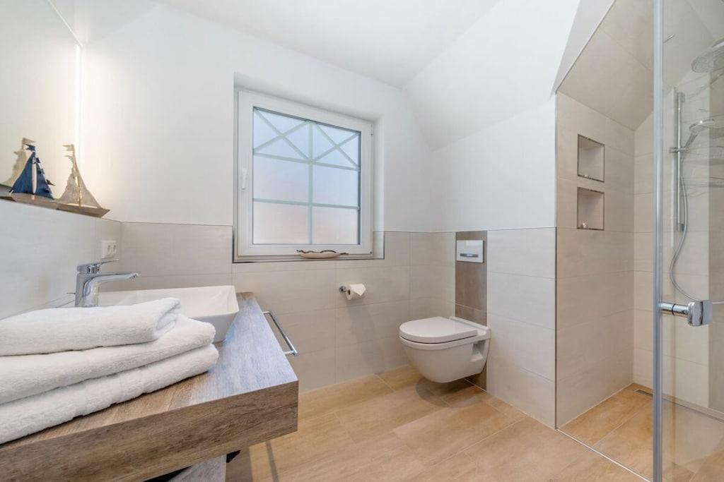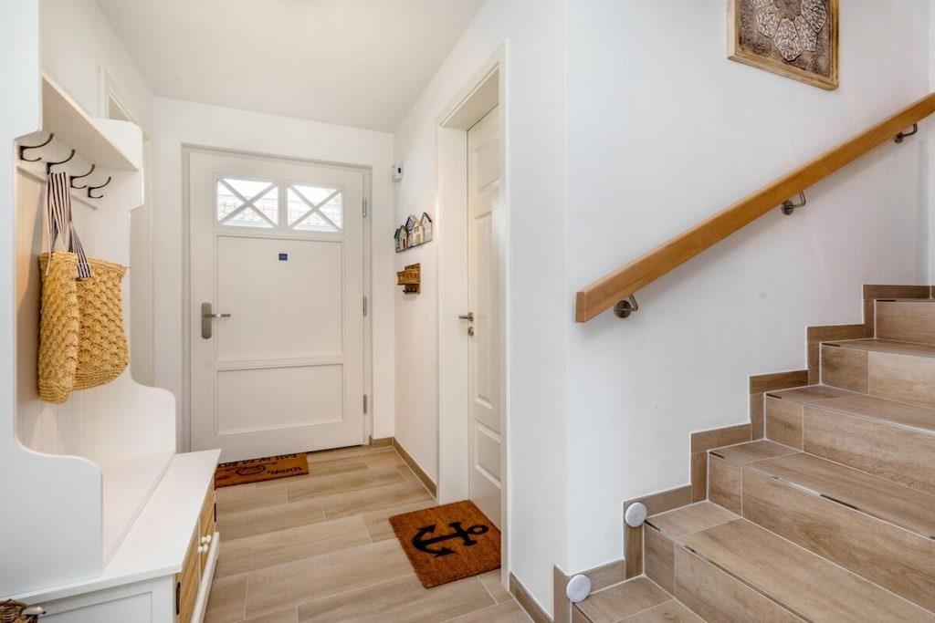 Der lichtdurchflutete Wohnbereich verfügt über eine offene Küche, einen Essbereich für bis zu 8 Personen und einer gemütlichen Couch. Das Haus verfügt über 4 Schlafzimmer und bietet somit Platz für bis zu 8 Personen. Zwei Schlafzimmer befinden sich im Obergeschoß des Ferienhauses und laden mit Boxspringbetten zum Ausschlafen ein. Ein weiteres Schlafzimmer im Obergeschoß ist mit 2 Einzelbetten ausgestattet. Der Dachboden im Darßer Stil, mit einem wunderschönen Panoramafenster, ist als weiteres Schlafzimmer ausgebaut und verfügt über eine Doppelbettschlafcouch.Die hauseigene Sauna (mit Münzautomat), im Badezimmer des Erdgeschosses, macht den Ostseeurlaub gerade in den kühleren Monaten zu einem echten Wohlfühlurlaub.