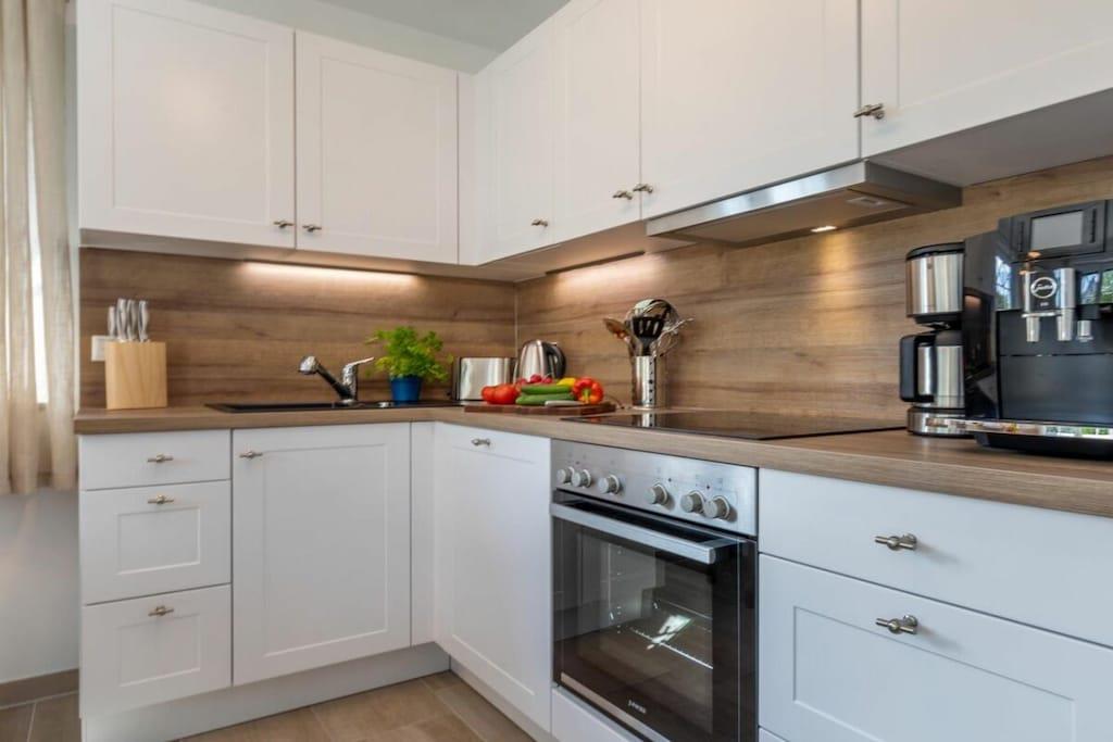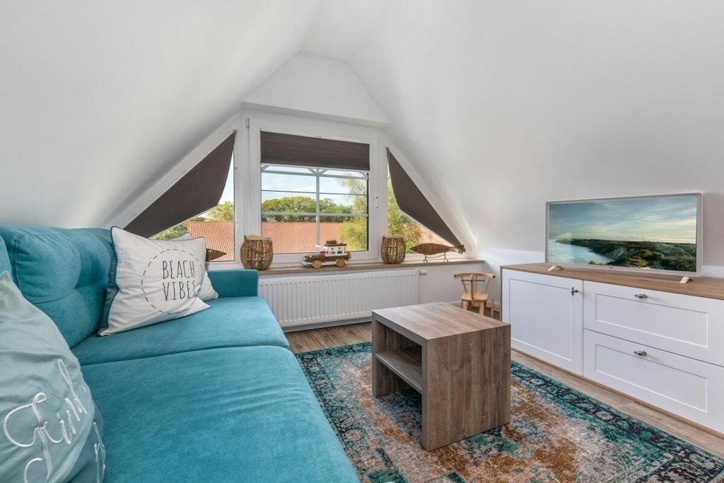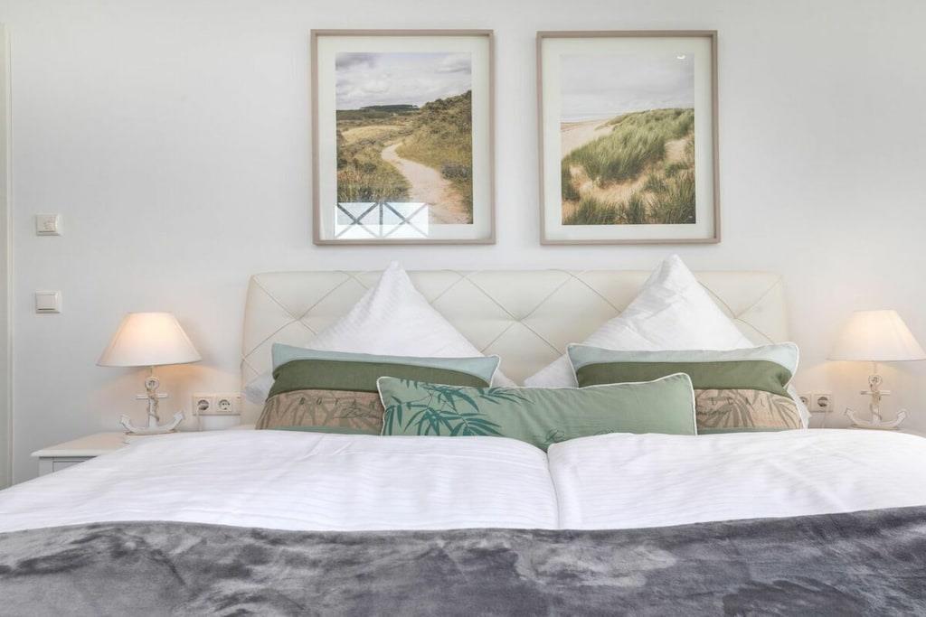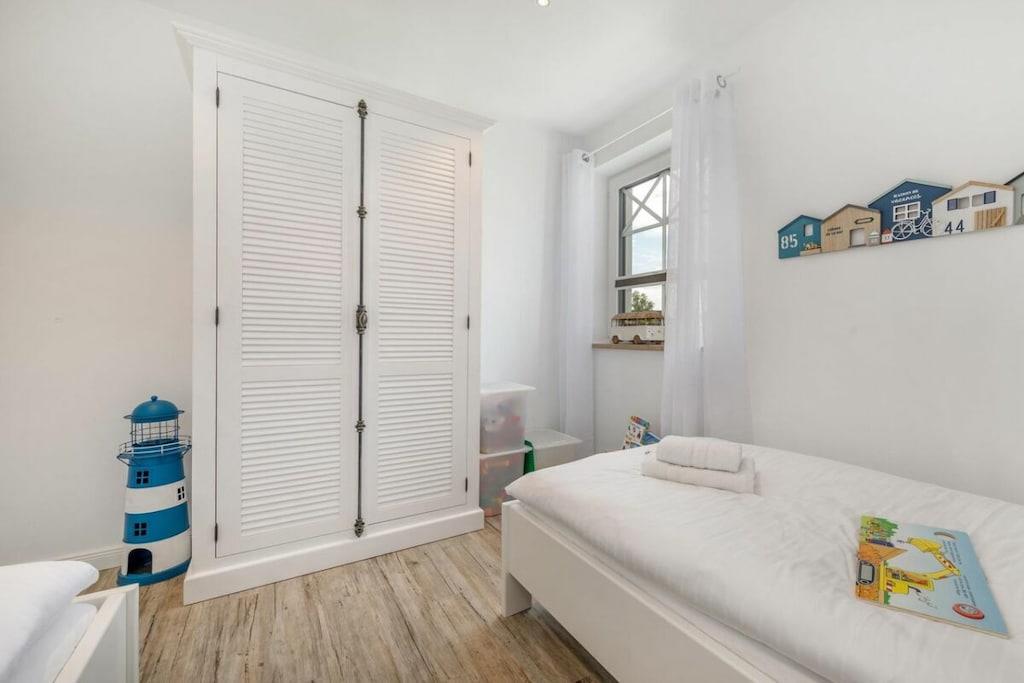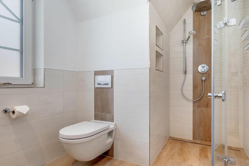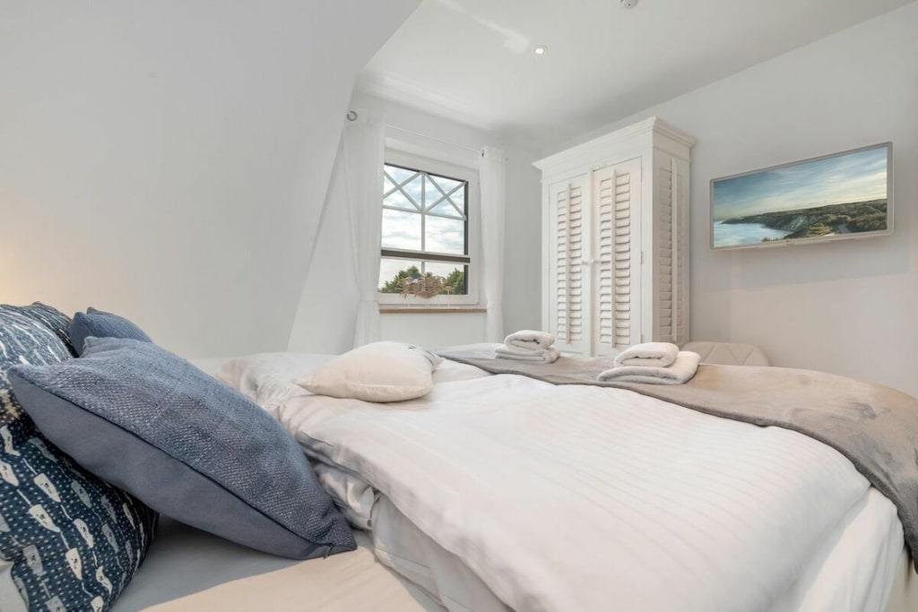 Der lichtdurchflutete Wohnbereich verfügt über eine offene Küche, einen Essbereich für bis zu 8 Personen und einer gemütlichen Couch. Das Haus verfügt über 4 Schlafzimmer und bietet somit Platz für bis zu 8 Personen. Zwei Schlafzimmer befinden sich im Obergeschoß des Ferienhauses und laden mit Boxspringbetten zum Ausschlafen ein. Ein weiteres Schlafzimmer im Obergeschoß ist mit 2 Einzelbetten ausgestattet. Der Dachboden im Darßer Stil, mit einem wunderschönen Panoramafenster, ist als weiteres Schlafzimmer ausgebaut und verfügt über eine Doppelbettschlafcouch.Die hauseigene Sauna (mit Münzautomat), im Badezimmer des Erdgeschosses, macht den Ostseeurlaub gerade in den kühleren Monaten zu einem echten Wohlfühlurlaub.