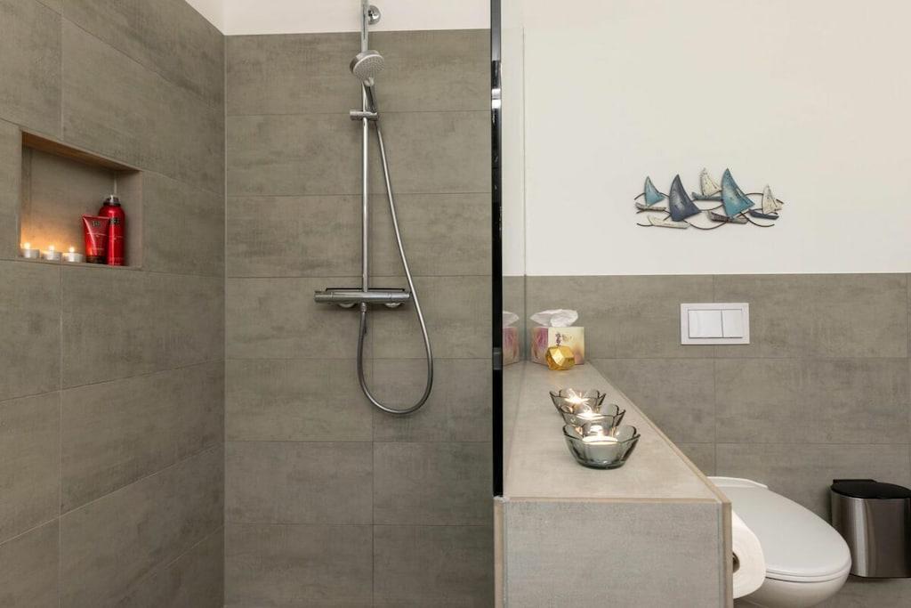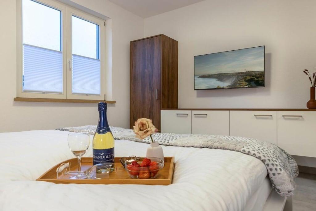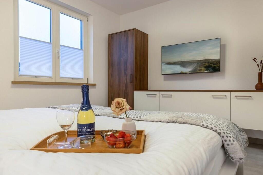 Die im Erdgeschoß gelegene neu gebaute Ferienwohnung mit moderner und geschmackvoller Einrichtung. Viel Licht durch die großen bodentiefen Terrassentüren. Das Wohnzimmer mit Sitzgarnitur und gemütlicher Schlafcouch (160x200 cm), sowie die Einbauküche mit sehr guter Ausstattung. Eine Terrasse mit Gartenmöbeln, zwei LCD -TV, das Schlafzimmer mit Doppelbett und das stilvoll geräumige Bad, mit viel Ablagefläche. Im Hauswirtschaftsraum stehen die münzbetriebene Waschmaschine und der Trockner. Für Fahrradbegeisterte ist auf dem Außengelände ein abschließbarer Unterstellschuppen vorhanden.