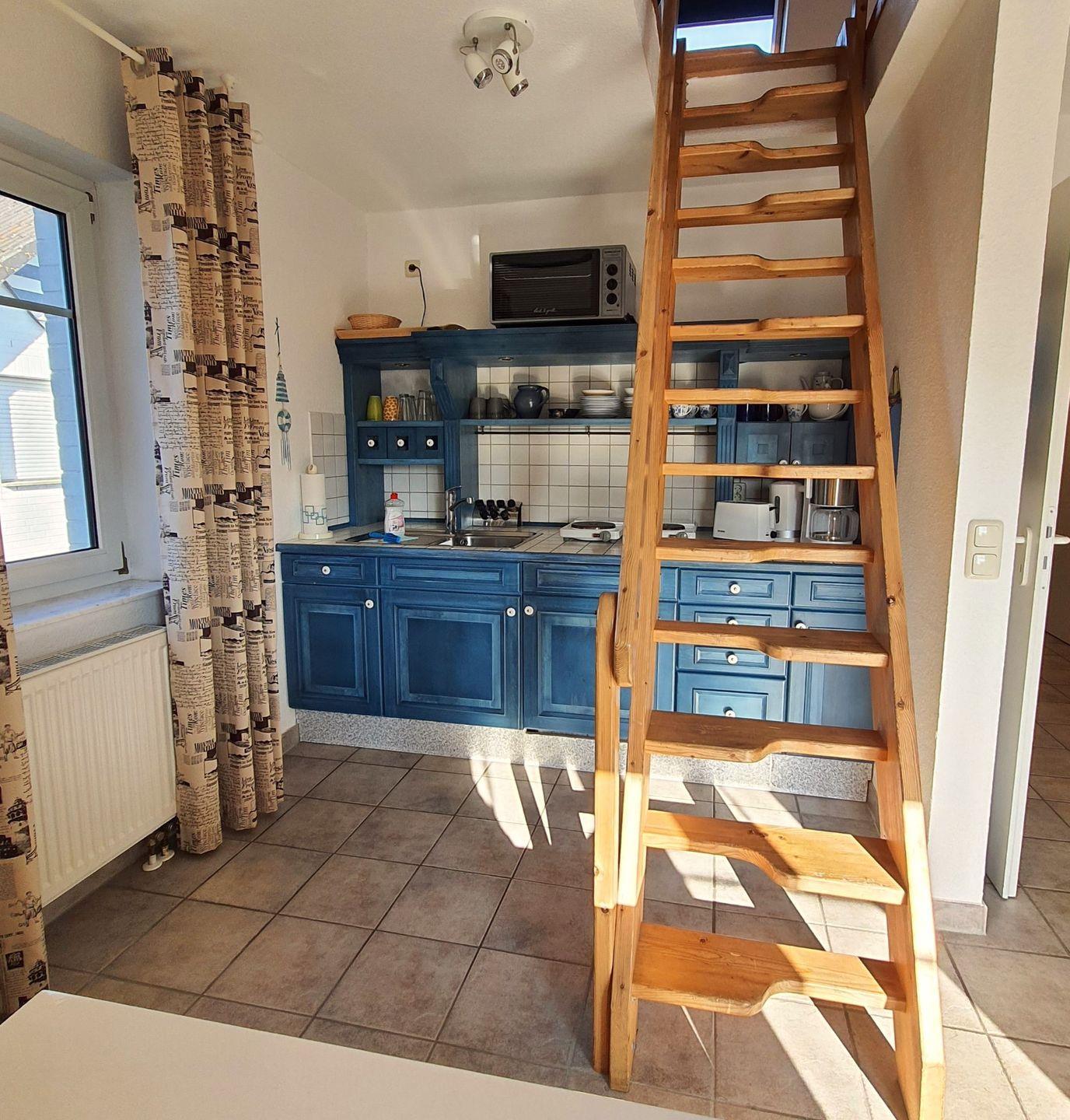 Große Ferienwohnung über 2 Ebenen in einem Appartmenthaus, ca.75 m² groß, im OG, mit Balkon, Wohnzimmer mit kleiner Küchenzeile und TV, 2 Schlafzimmer mit Doppelbett, einem Bad mit Dusche/WC. Im oberen Teil der Wohnung befindet sich ein offenes Schlafzimmer mit einer Sitzgelegenheit. Dieses ist mittels einer Raumspartreppe vom Wohnbereich aus zu erreichen.