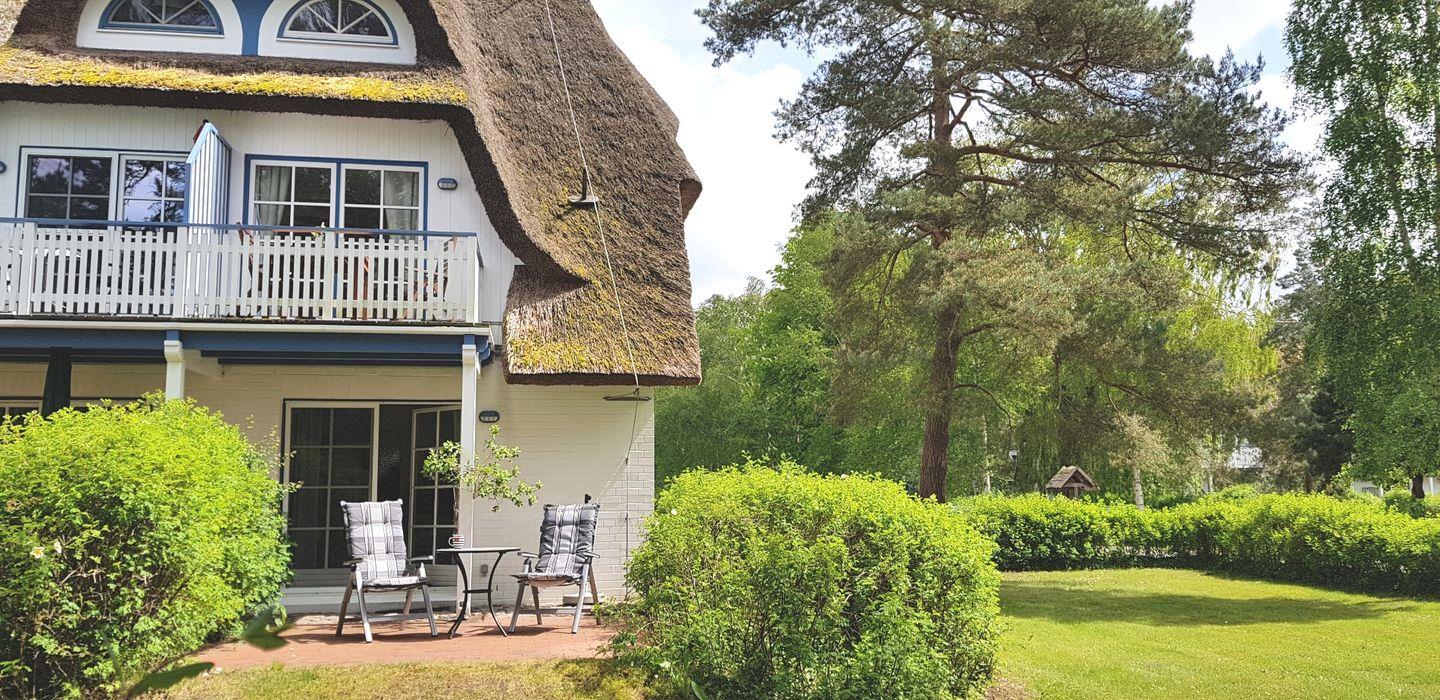Die reetgedeckte Ferienanlage liegt etwas außerhalb, direkt hinter dem Ostseedeich. Die 41qm große Eckwohnung wird für max. 2 Personen vermietet. Die Erdgeschosswohnung hat einen Wohn-Essbereich mit einer anschließenden Westterrasse. Im Schlafzimmer befindet sich ein Doppelbett (1,80 x 2,00 m) und das Bad ist mit Dusche und WC ausgestattet. Die großzügige Terrasse mit Blick in den westlichen Garten lädt zum Entspannen und Verweilen ein.