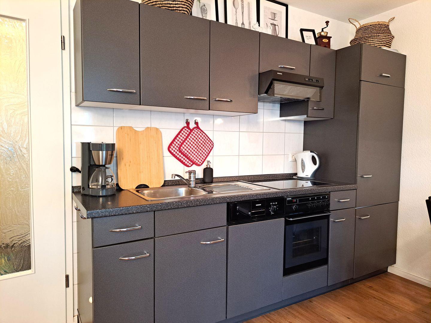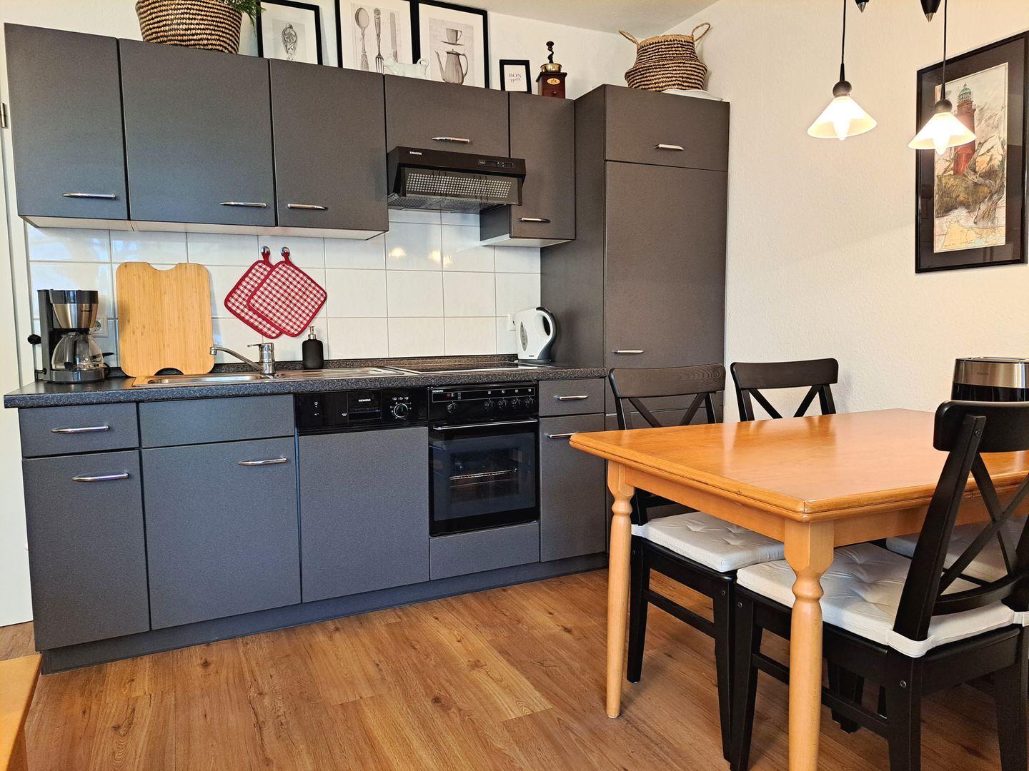 Die Wohnung teilt sich auf in den Wohnraum mit integrierter Küche und daran anschließender Terrasse mit West-Ausrichtung sowie einem Schlafzimmer mit Ehebett und ein Badezimmer mit Dusche und Toilette.