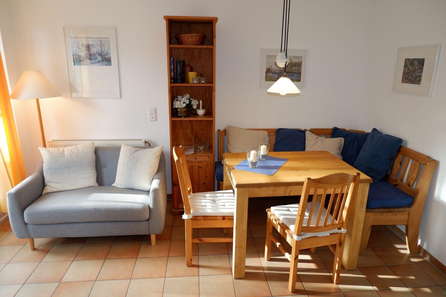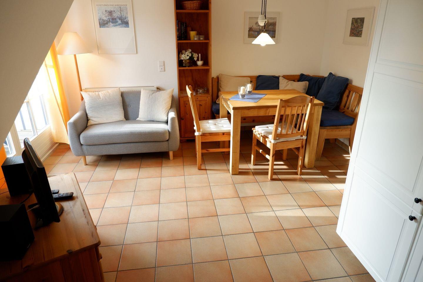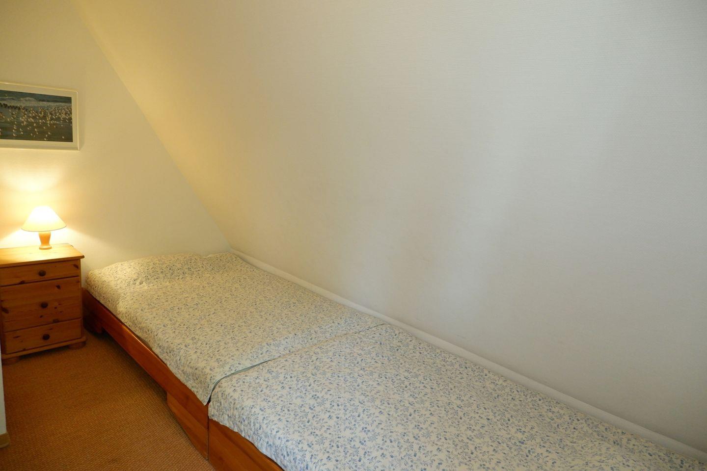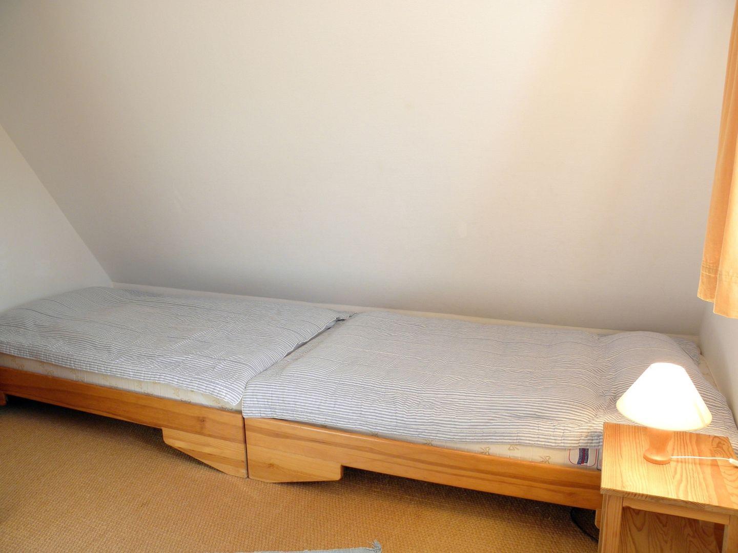 Auf der Wohnebene der Maisonettwohnung sind der Wohnbereich mit integrierter Küche, die Essecke und der Westbalkon sowie das Bad mit Dusche und WC und 1 Schlafzimmer mit 2 Einzelbetten. Im Obergeschoss befindet sich ein weiteres Schlafzimmer mit Ehebett.