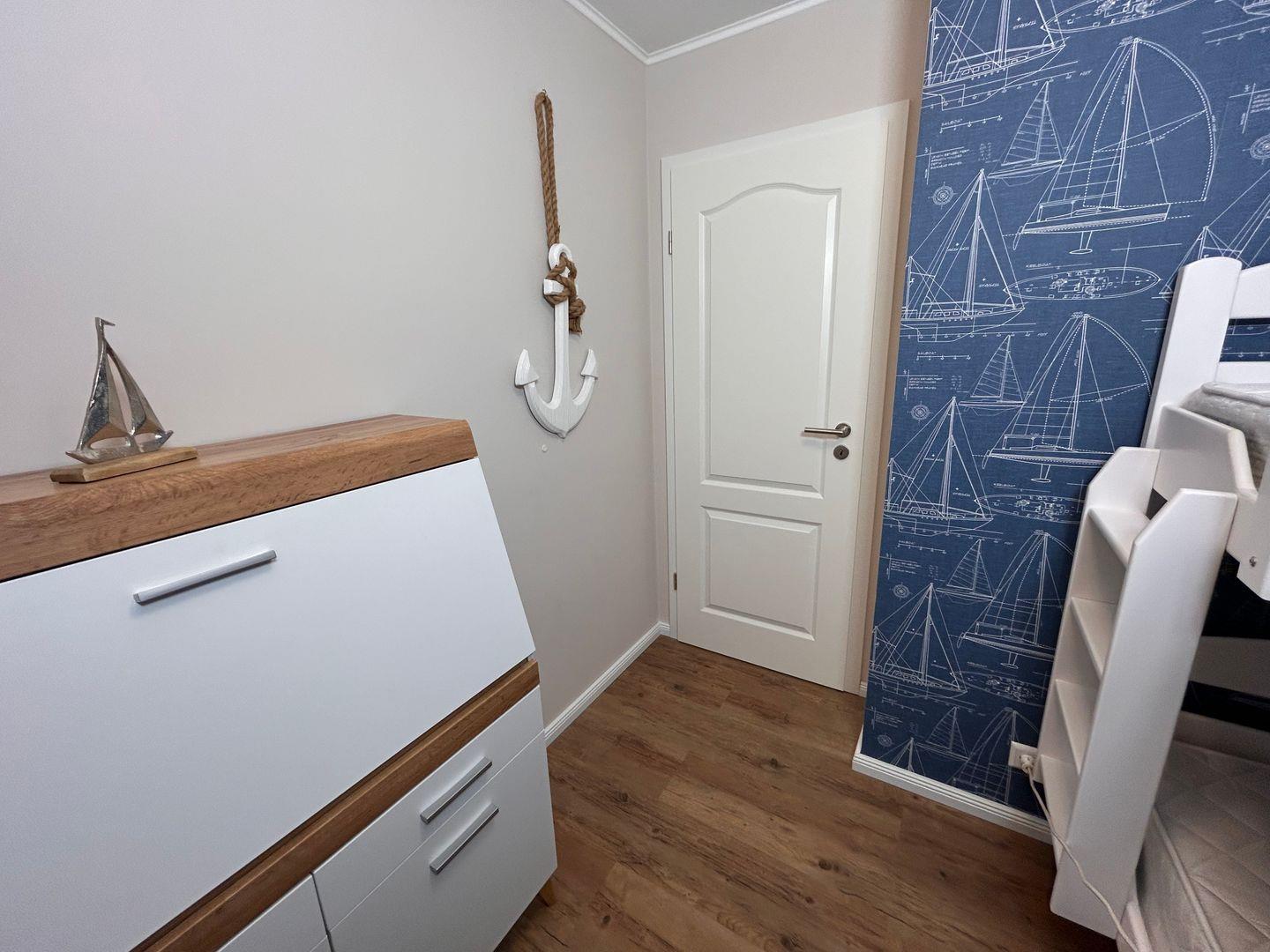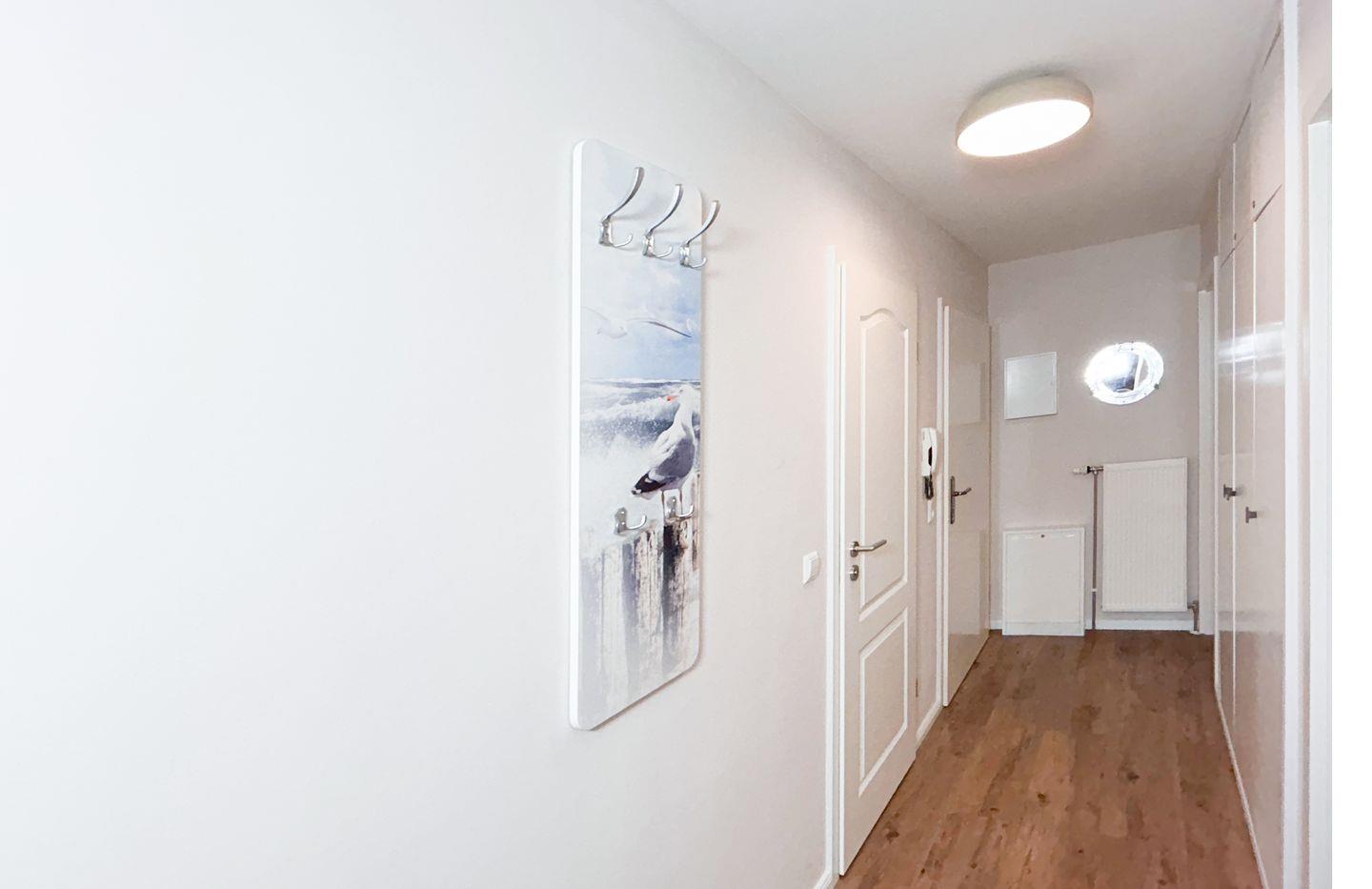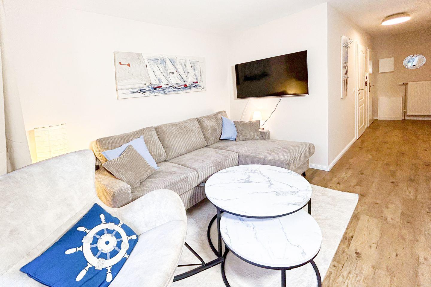 Im Inneren überzeugt die Wohnung durch ihre hochwertige, stilvolle Einrichtung im maritimen Design. Zwei gemütliche Schlafzimmer bieten ausreichend Platz für erholsame Nächte. Der großzügige Wohnbereich lädt mit einem modernen 55-Zoll-Fernseher zu entspannten Abenden ein.
