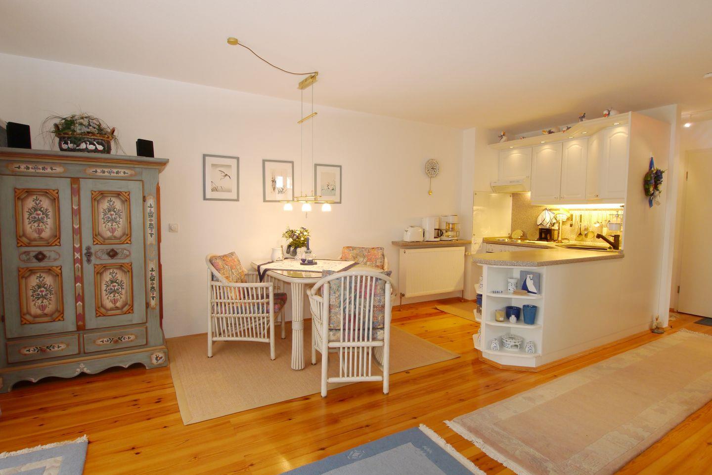 Eine gut ausgestattet Wohnung mit Wohn-Essbereich und integrierter Küche sowie der schönen Südterrasse mit Strandkorb, ein Bad mit Dusche, Toilette und Waschmaschine. Im Schlafzimmer steht ein Ehebett und ein zweites Fernsehgerät.