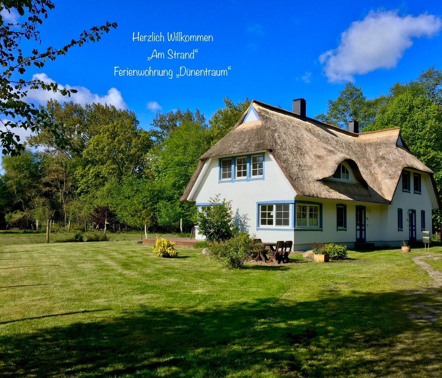 Herzlich Willkommen im Reethaus "Am Strand" in exklusiver Lage direkt hinter der Düne am Ostseestrand. Privatsphäre auf großem Naturgrundstück. In wenigen Augenblicken den Ostseesand zwischen den Füßen spüren und dem Rauschen der Wellen lauschen. Ruhe und pure Natur für Ihre Erholung, Freiheit und weite Sicht ins Naturreservat. Die lichtdurchflutete 50qm Ferienwohnung "Dünentraum" wartet auf 2 Gäste im OG des idyllisch gelegenen Strandhauses. Zu zweit oder auch gern als kleine Familie mit Baby sind Sie herzlich willkommen. Schöner heller Wohnraum mit einladendem Wohnkonzept. Küche und Essbereich mit allem Komfort. Traum Schlafzimmer mit großem Doppelbett, Kleiderschrank, Kommode, Sat-TV und Rundgaube, süßes helles Tageslichtbad mit Glasdusche und Rundgaube. Aussenmöbel auf Sonneninsel. Weitläufige eigene Liegewiese mit freiem, weitem Naturblick. Freies WLAN, kostenfreie Parkplätze und Fahrradständer direkt am Haus.