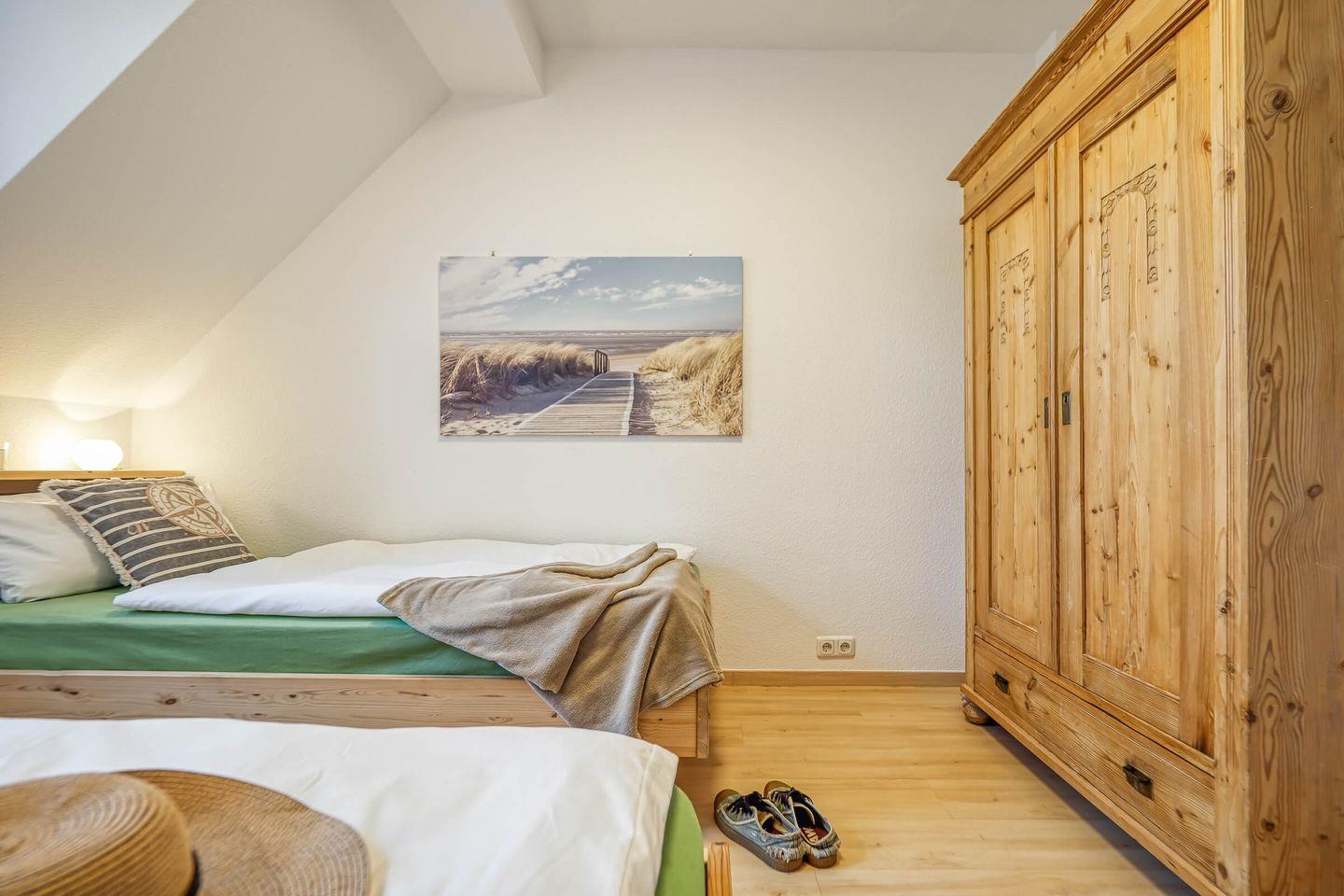 Die 75 qm große Maisonettewohnung bietet 5 Schlafplätze (90 cm x 200 cm). Ein Schlafzimmer verfügt über ein Doppelbett, ein Schlafzimmer über zwei Einzelbetten, und ein Bett befindet sich im DG in einer Nische, getrennt vom Wohnbereich.