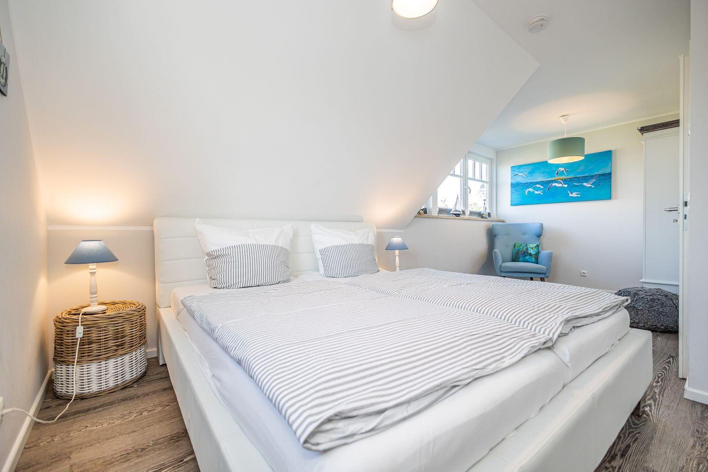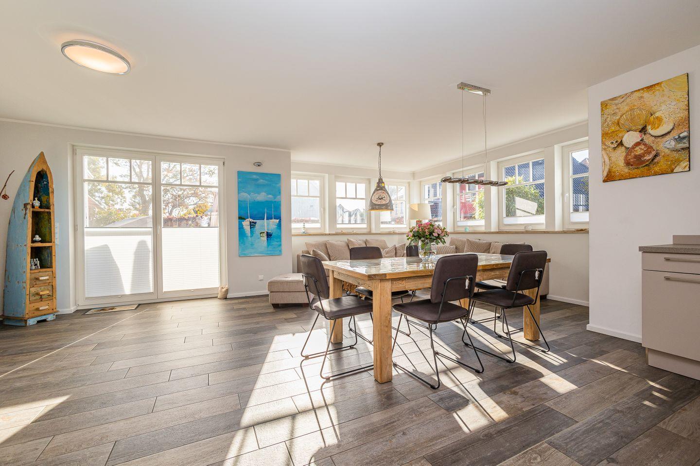 Die 125 qm große Doppelhaushälfte bietet auf drei Etagen Platz für bis zu 4 Erwachsene und 2 Kinder. Im Erdgeschoss ist das Wohnzimmer mit dem Kaminofen zu finden, Essbereich und Küchenzeile schließen sich direkt an. Der Zugang zur Süd-/Westterrasse und ein Badezimmer mit ebenerdiger Dusche liegen ebenfalls hier. In der 1. Etage befinden sich zwei Schlafzimmer, jeweils mit Doppelbett und TV, das Badezimmer mit ebenerdiger Dusche und Badewanne und auch die Münzsauna. Die offene Galerie im Dachgeschoss verfügt über zwei Schlafsofas. Das Objekt verfügt über zwei Parkplätze. Der Eingangsbereich sowie der Parkplatz werden videoüberwacht. Kleine Hunde sind ausdrücklich nach vorheriger Anfrage, im Einzelfall möglich.