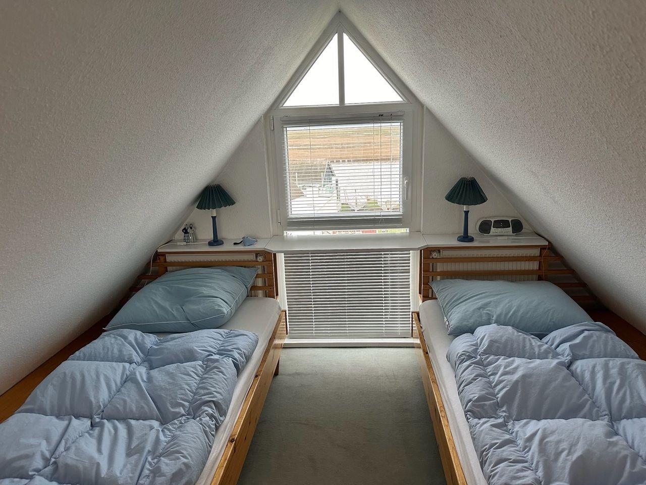 Über eine Wendeltreppe erreichen Sie das Schlafzimmer mit zwei einzel stehenden Betten und einem zweiten Fernseher.