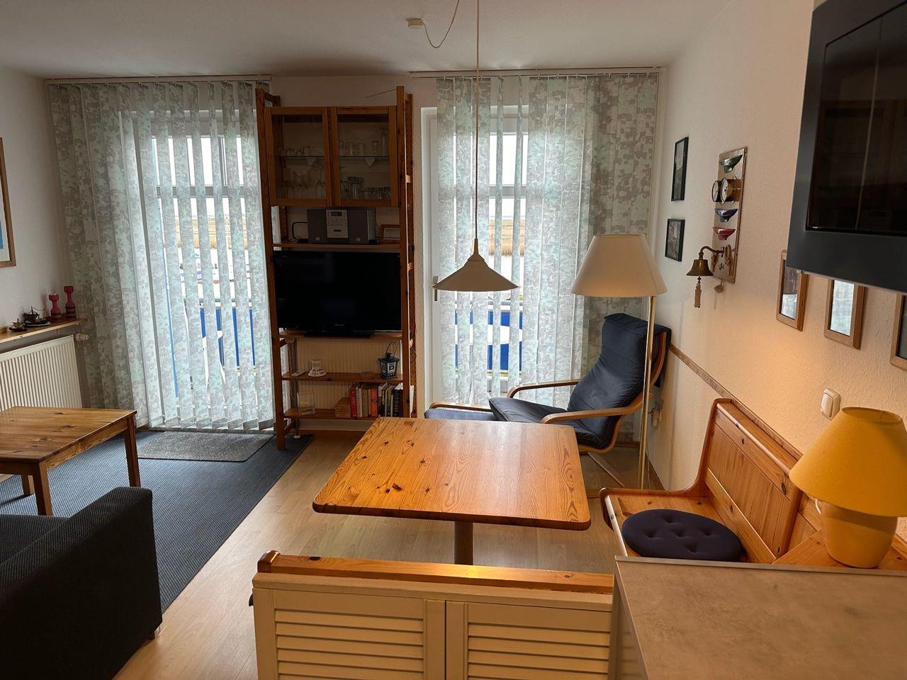 Die Wohnebene umfasst den Wohnraum(von hier gelangen Sie auch auf den Südbalkon mit Blick auf den Hafen und das Boddengewässer), eine integrierte Küche und das Bad mit Dusche und WC.