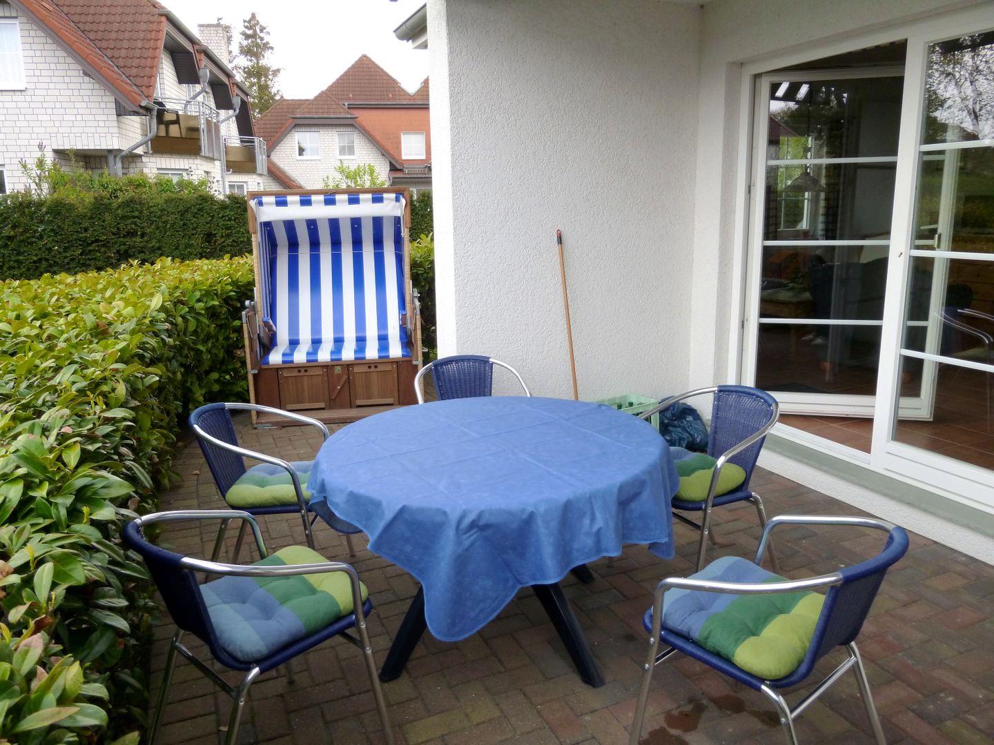 Gemütliche Erdgeschosswohnung in Zingst mit Terrasse und Strandkorb, ideal für Familienurlaub.