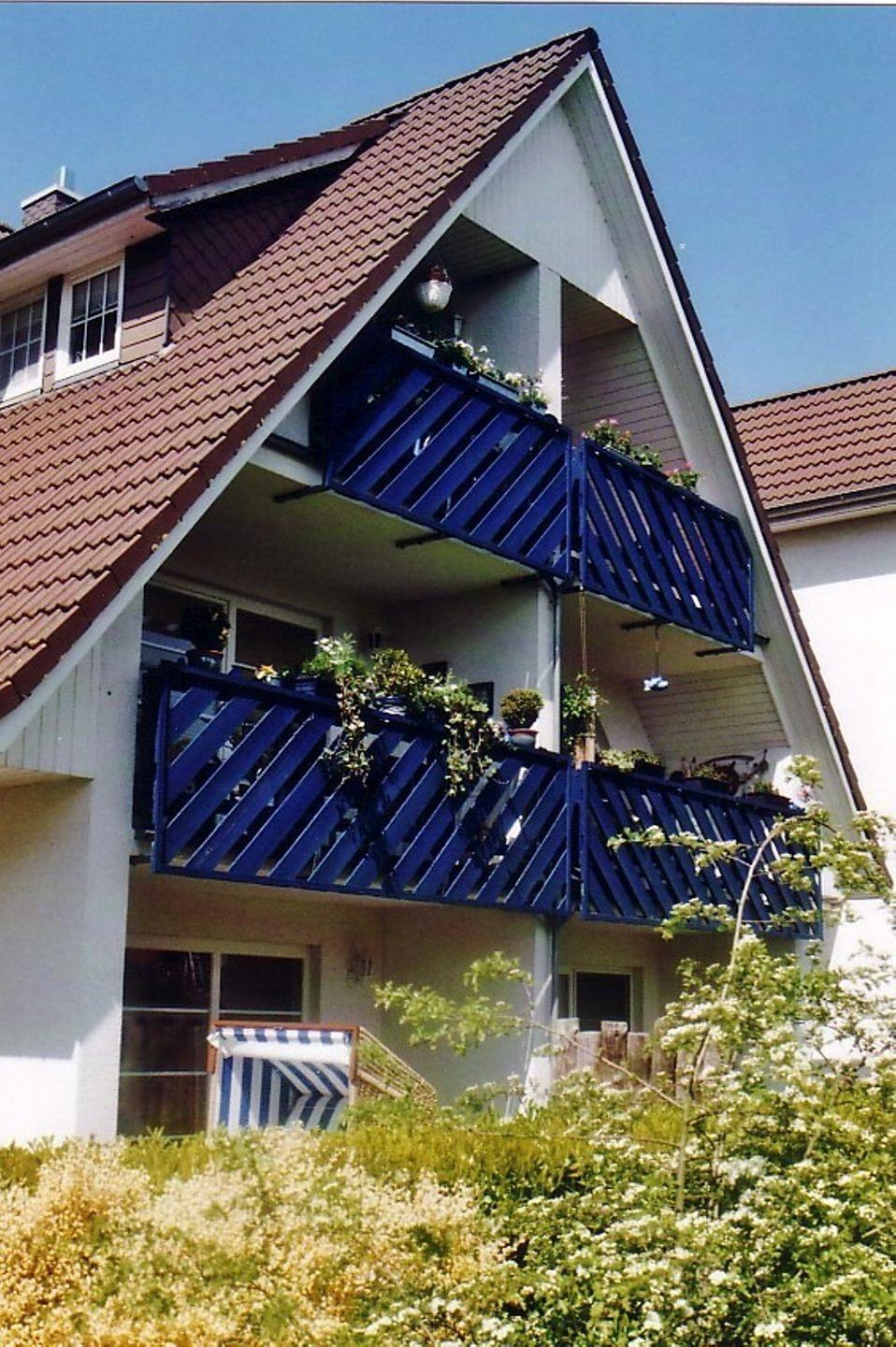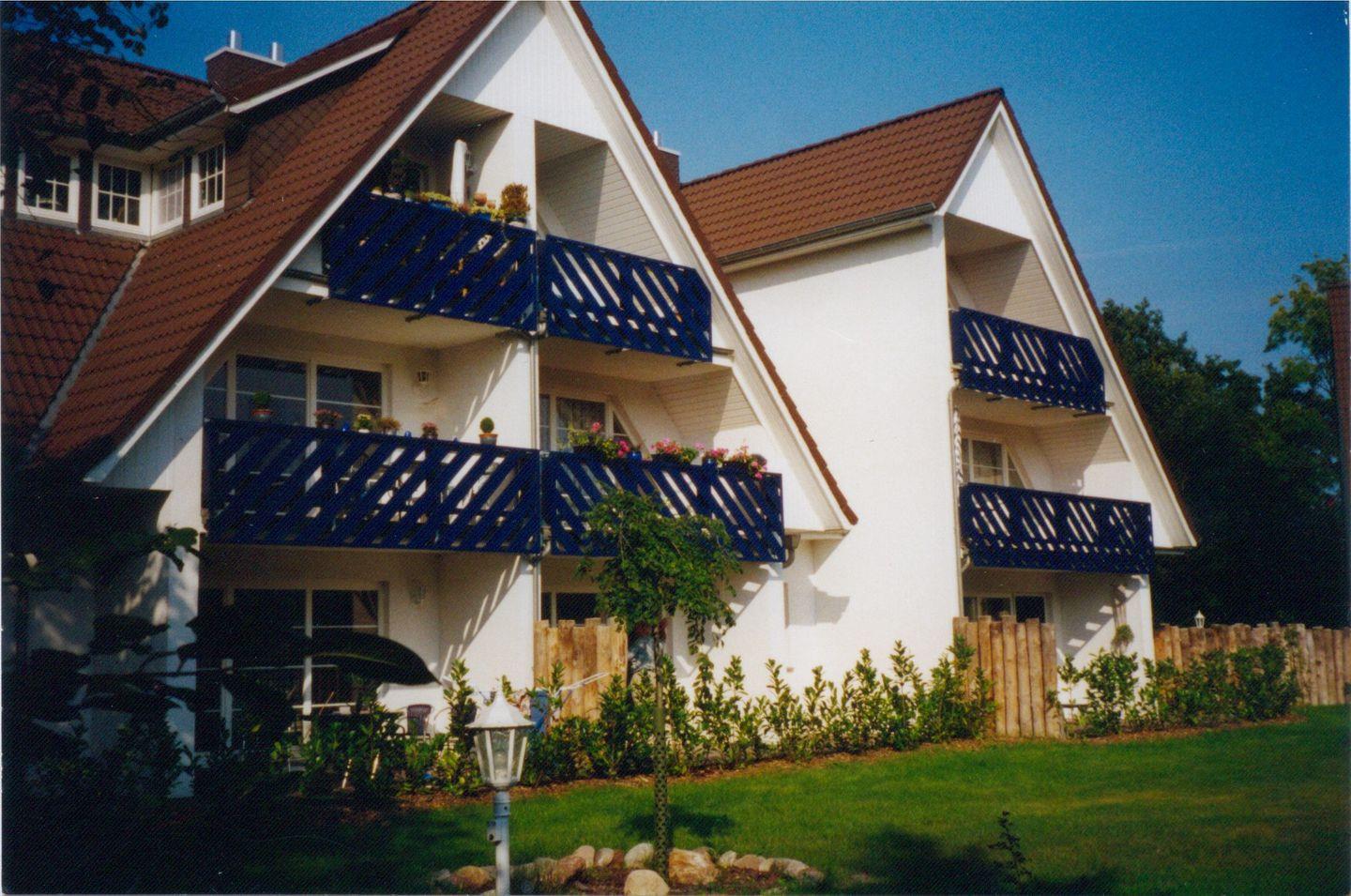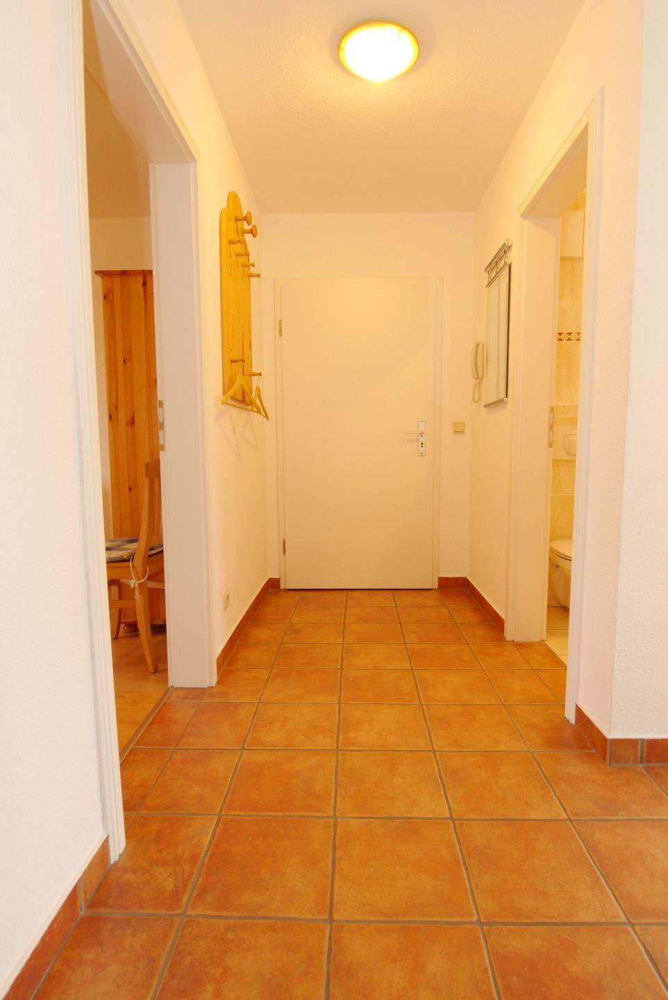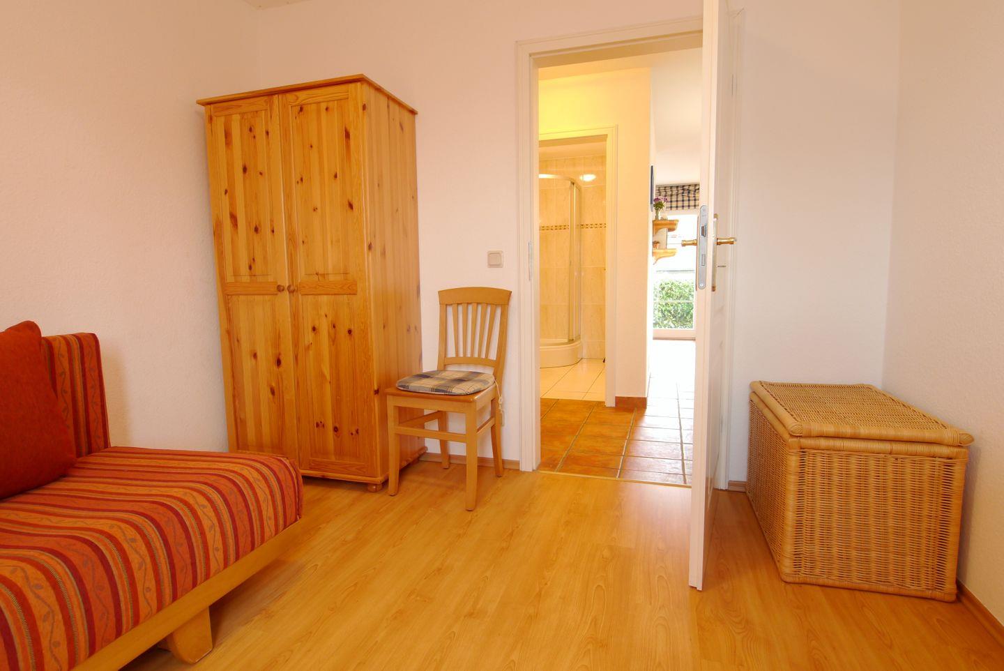 Diese 70 m² große Erdgeschoßwohnung wird für bis zu 2 Erwachsene und 2 Kinder angeboten. Über den Eingangsflur mit Garderobe gelangt man in das Wohnzimmer mit integrierter Küche, Essbereich und Zugang zur Ostterrasse mit Strandkorb. Das größere Schlafzimmer ist mit einem Doppelbett ausgestattet und im kleinen Schlafzimmer steht eine Schlafcouch für bis zu zwei Personen sowie das Kinderreisebett. Das Badezimmer ist mit einer Dusche versehen und im Aussenbereich steht ein Fahrradschuppen zur Verfügung.