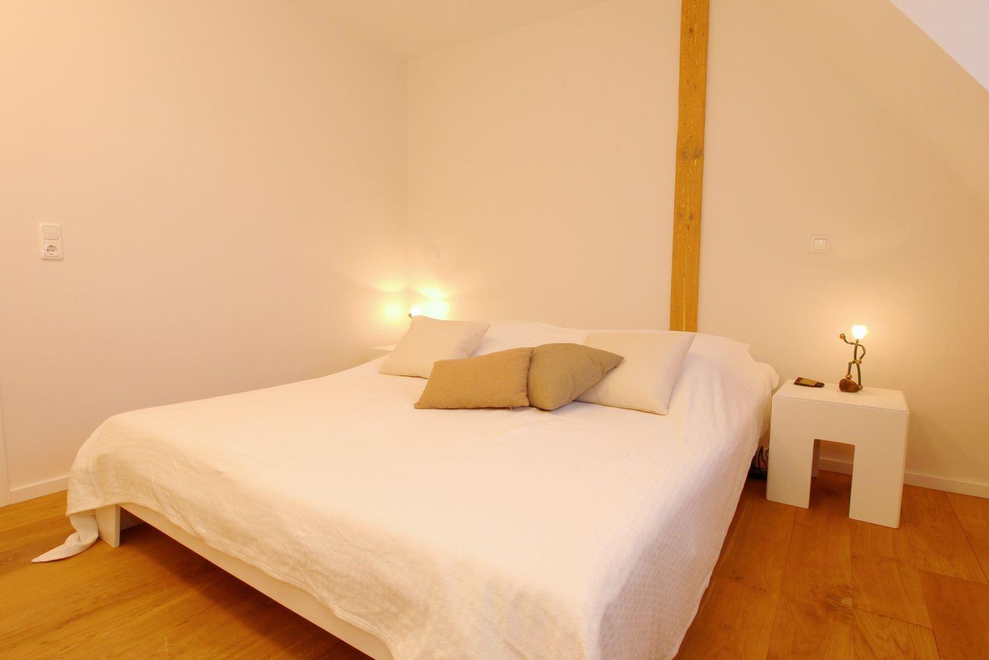 In der 1. Etage befinden sich 3 Schlafzimmer (2x mit Doppelbett, 1x mit 2 Einzelbetten), 1 Badezimmer mit Wanne und Dusche, 1 weiteres Badezimmer mit Dusche sowie 1 Schlafzimmer (Doppelbett) mit Zugang zum Dachgeschoss.