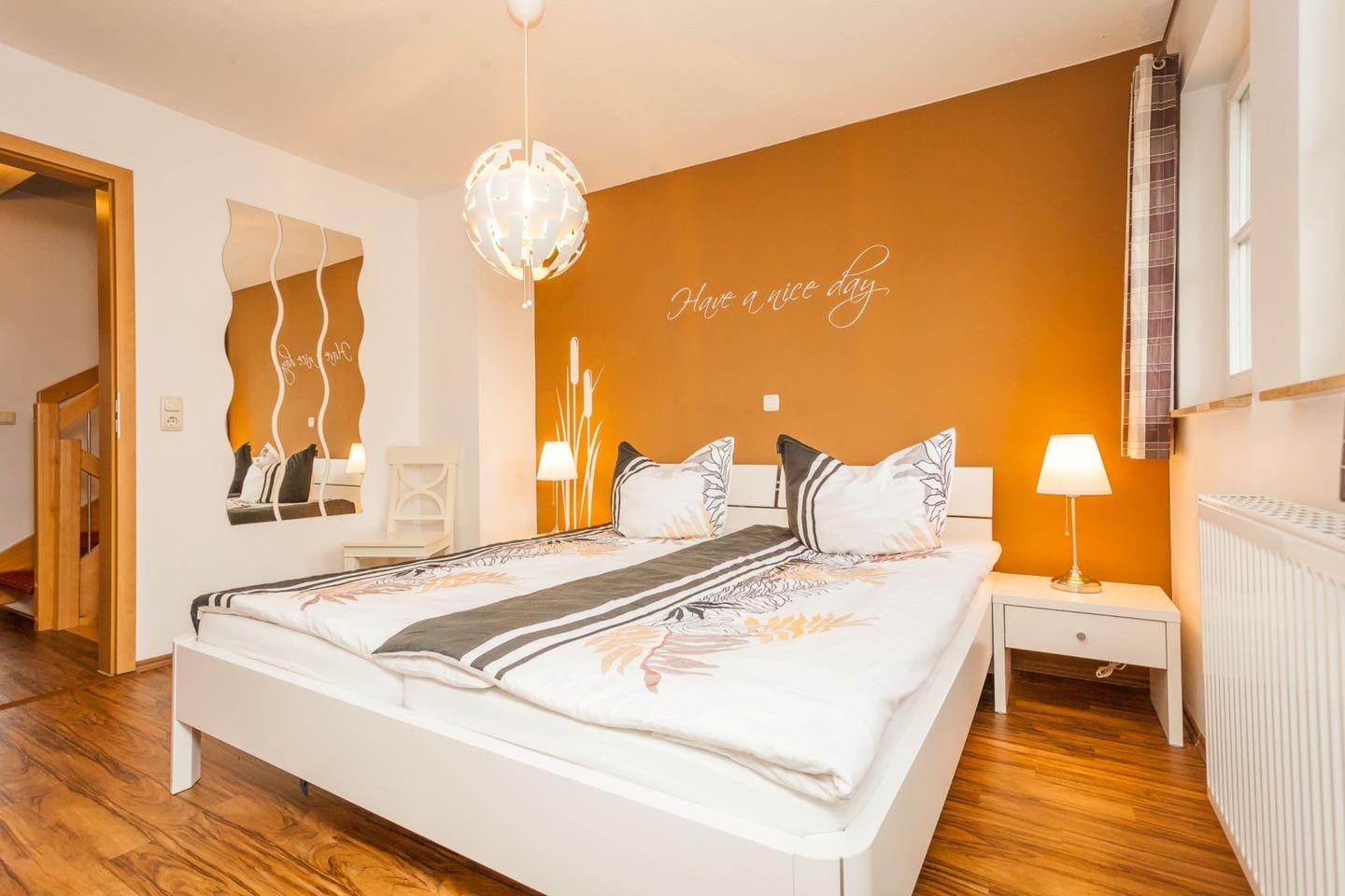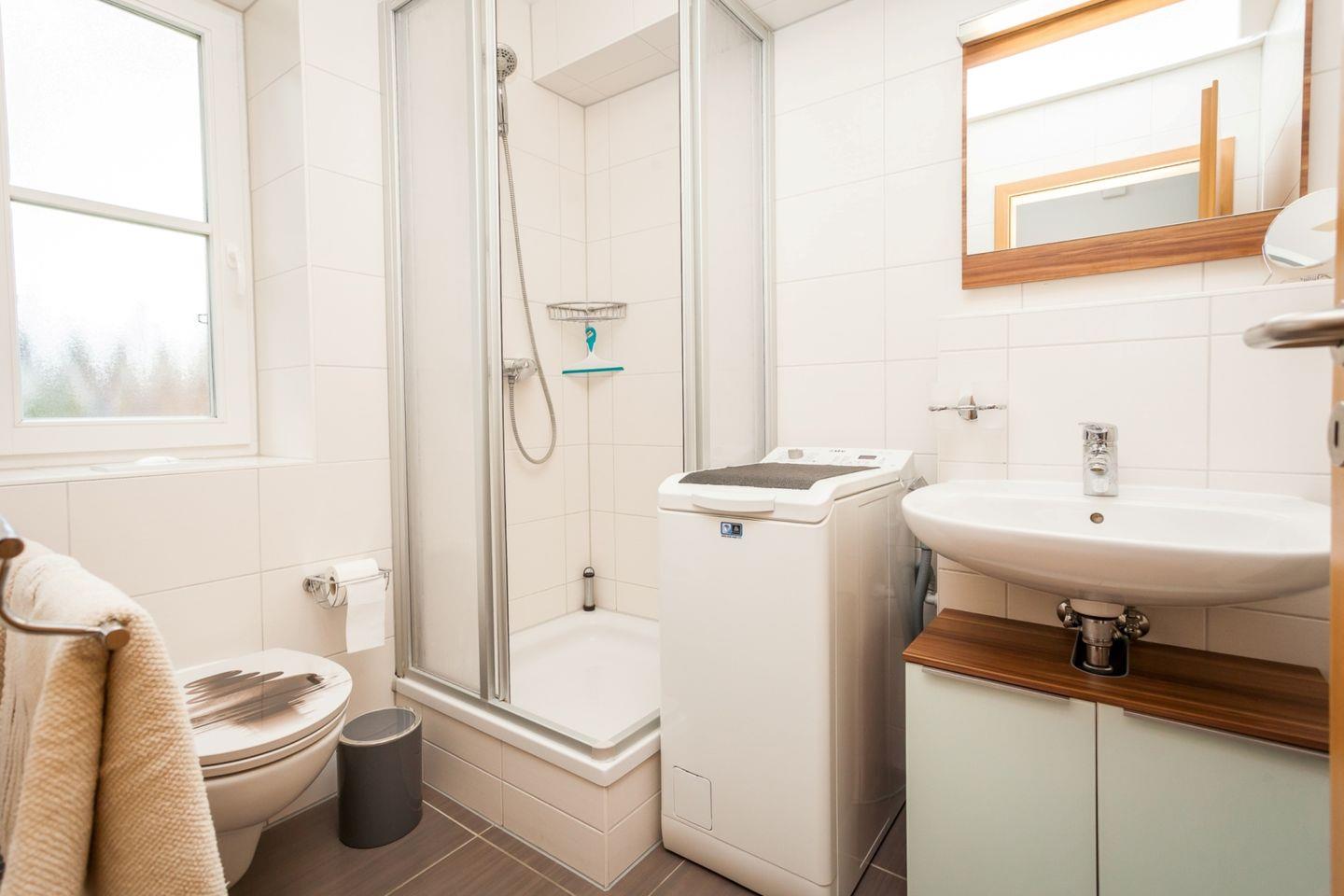 Diese 95 m² große Doppelhaushälfte erstreckt sich über drei Etagen und bietet Platz für maximal 4 Erwachsene + 2 Kinder. Das Wohnzimmer mit Kaminofen und Zugang zur Westterrasse befindet sich im Erdgeschoss und geht in den Essbereich mit Küchenzeile über. Hier ist auch das Badezimmer mit Dusche und Waschmaschine zu finden. In der 1. Etage liegen zwei Schlafzimmer, eines mit Doppelbett und das andere mit zwei Einzelbetten. Das Bad mit Glasdusche und Münzsauna ist ebenfalls hier untergebracht. Im Dachgeschoss liegt ein Schlafzimmer mit zwei Einzelbetten. 2 PKW-Stellplätze und ein Fahrradschuppen können ebenfalls genutzt werden.