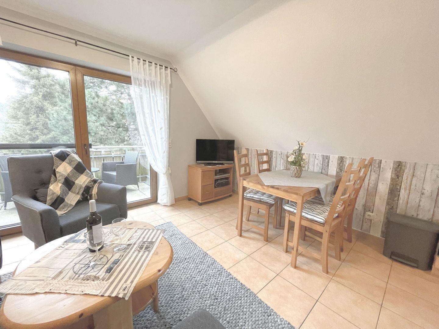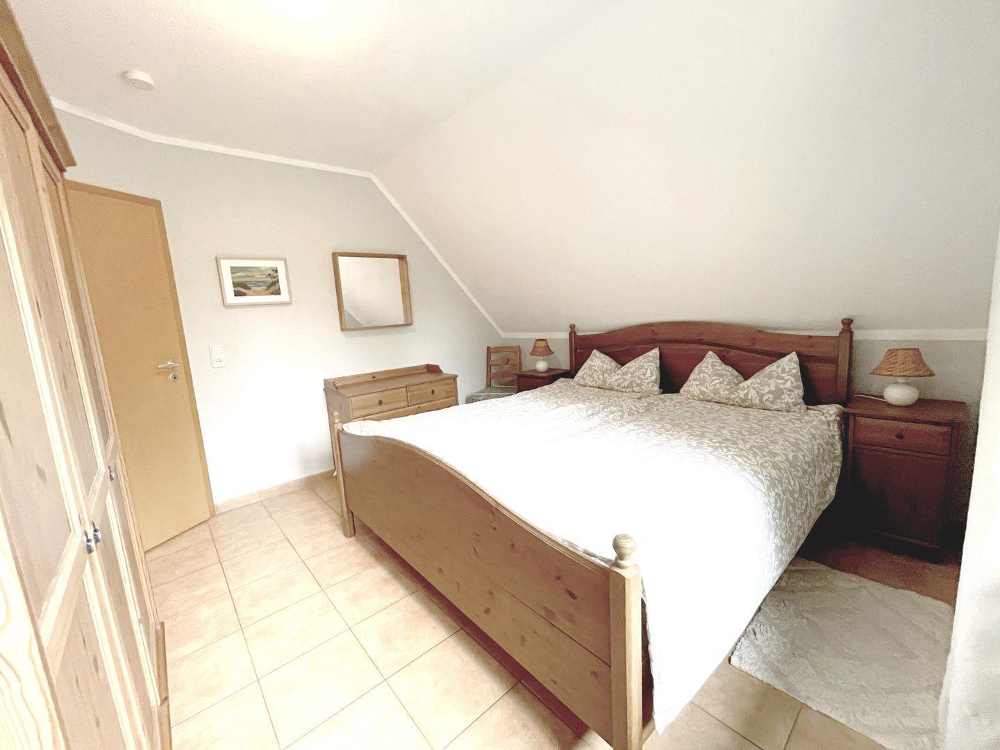 Die 50 m² große Maisonettewohnung wird bevorzugt an 2 Erwachsene und 2 Kinder vermietet. Der Wohnraum mit integrierter Küche und Essecke hat einen direkten Zugang zum Nordbalkon, dieser ist im Sommer angenehm kühl. Das Bad mit Dusche und WC befindet sich auf der Wohnebene ebenso wie das Elternschlafzimmer mit Ehebett. Das 2. Schlafzimmer ist mit 2 Einzelbetten ausgestattet und liegt im Dachgeschoss. Die bezogenen Betten sowie das Wäschepaket sind in diesem Objekt inklusive. Ein kleiner Elektrogrill für den Balkon und ein Interzugang über W-LAN ergänzen die Ausstattung.