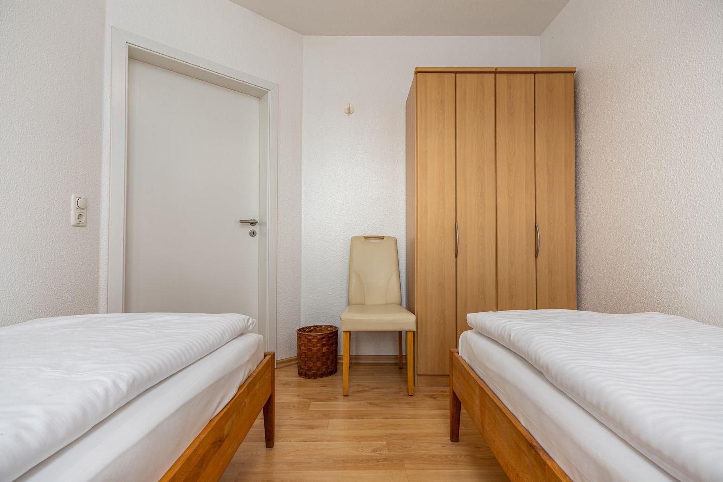 Die 59 qm große Erdgeschosswohnung wird für bis zu 2 Erwachsene + 2 Kinder angeboten. In den großen Wohnraum sind die Essecke und die große Küchenzeile integriert. Von hier erreichen Sie die beiden Terrassen, die nach Süden bzw. nach Westen ausgerichtet sind. Eines der Schlafzimmer ist mit einem Doppelbett eingerichtet, das andere mit zwei einzelnen Betten. Im Badezimmer befinden sich eine Badewanne und das WC. Außenrollos und Fliegengitter in allen Zimmern und ein Fahrradschuppen komplettieren die Ausstattung.