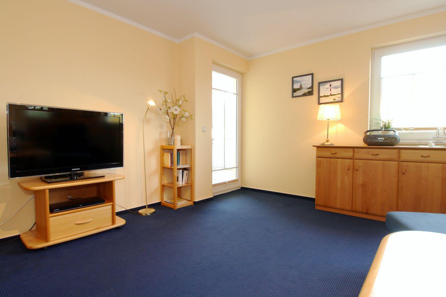 Die im 1. OG gelegene 64 qm große Wohnung wird für max. 4 Erwachsene vermietet. Das zentral gelegene Objekt hat einen großen Wohnraum, eine voll ausgestattete separate Küche, 2 Schlafzimmer (1x Doppelbett und 1x französisches Bett) sowie ein Badezimmer mit Dusche und WC. Der Nordbalkon lädt zum Beobachten des Geschehens ein. Ein Gemeinschaftsfahrradschuppen sowie 1 Pkw-Stellplatz sind ebenfalls vorhanden.