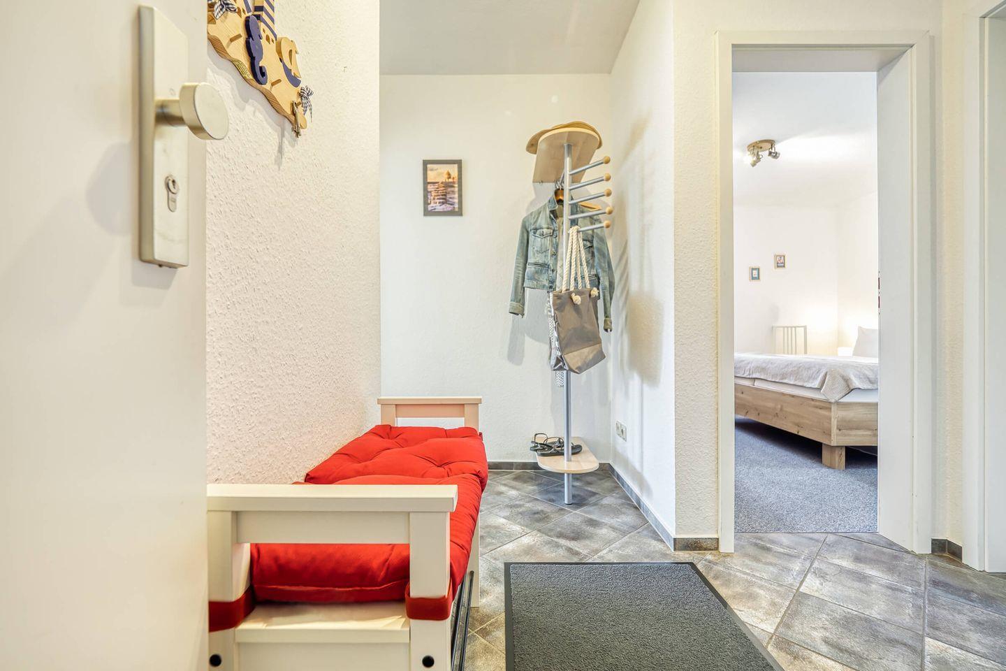 In ruhiger, zentraler Lage erwartet Sie diese gemütliche und liebevoll eingerichtete 48 qm große Erdgeschosswohnung mit West-Terrasse. Maximal 2 Erwachsene und ein Baby können in der Wohnung erholsame Urlaubstage verbringen. Über den Eingangsbereich mit Garderobe gelangen Sie in den Wohnbereich, das Bad sowie das Schlafzimmer mit einem großen Doppelbett. Das Tageslichtbad ist mit einer bodengleichen Glasdusche, einem Waschtisch mit Spiegelschrank und WC ausgestattet. Der lichtdurchflutete Wohnbereich unterteilt sich in die offene Küche, Essecke und einen großzügigen Sitzbereich, der zum Verweilen einlädt. Den Zugang zur möblierten Terrasse finden Sie ebenfalls hier. Ein eigener PKW-Stellplatz direkt vor der Haustür, ein Schuppen zum Abstellen Ihrer mitgebrachten Fahrräder, Fliegengitter und kostenloses WLAN runden das Angebot ab. Eine weitere Annehmlichkeit sind der Bäcker, Metzger und Einkaufmarkt in unmittelbarer Nähe zur Wohnung.