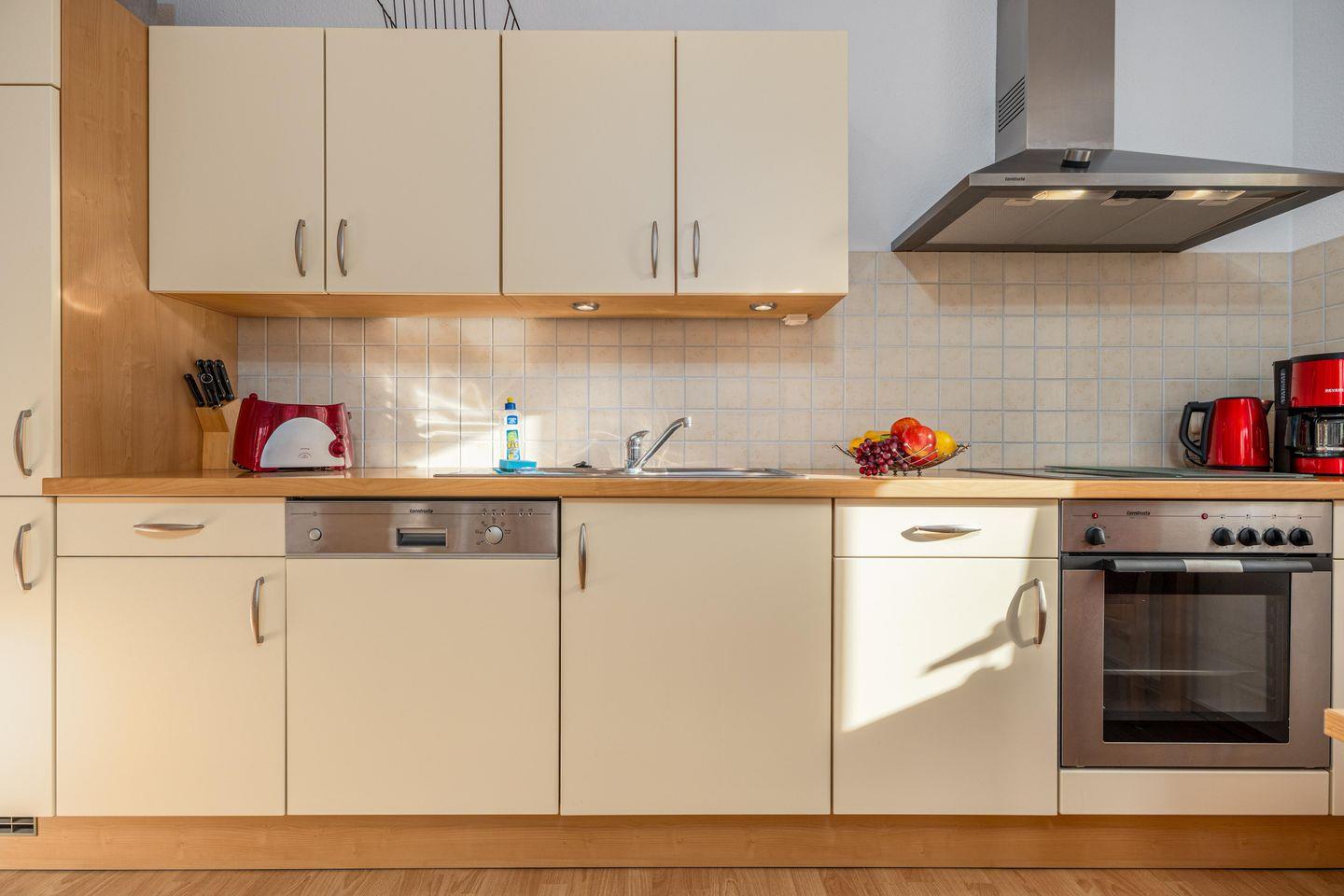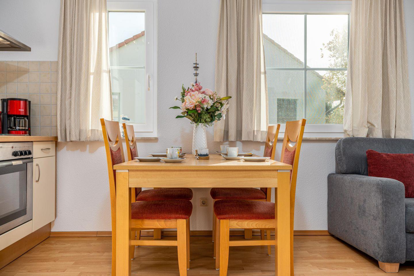 Die 60 m² große Wohnung liegt im 1. Obergeschoss und kann mit maximal 2 Erwachsenen + 2 Kindern angemietet werden. Der Wohnbereich ist aufgeteilt in die integrierte Küche und Essecke sowie einen großzügigen Sitzbereich, von hier aus erreichen Sie auch den Süd-Westbalkon. Es sind zwei Schlafzimmer vorhanden, eines ist mit einem Doppelbett und ein weiteres mit zwei Einzelbetten ausgestattet. Das Badezimmer verfügt über Dusche und WC. Für die Fahrräder steht ein Fahrradschuppen zur Verfügung.