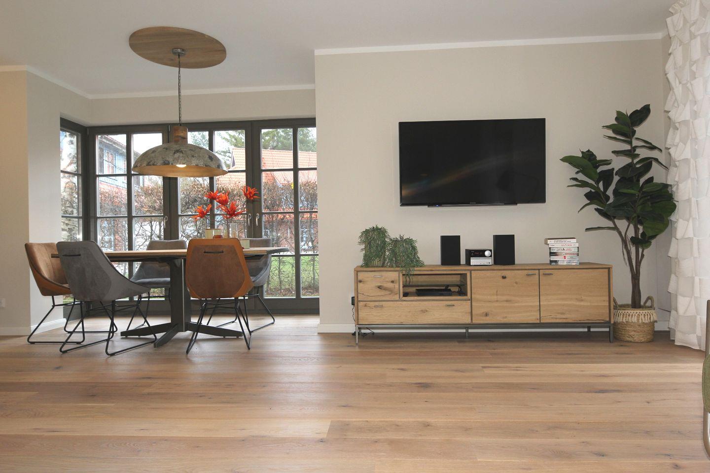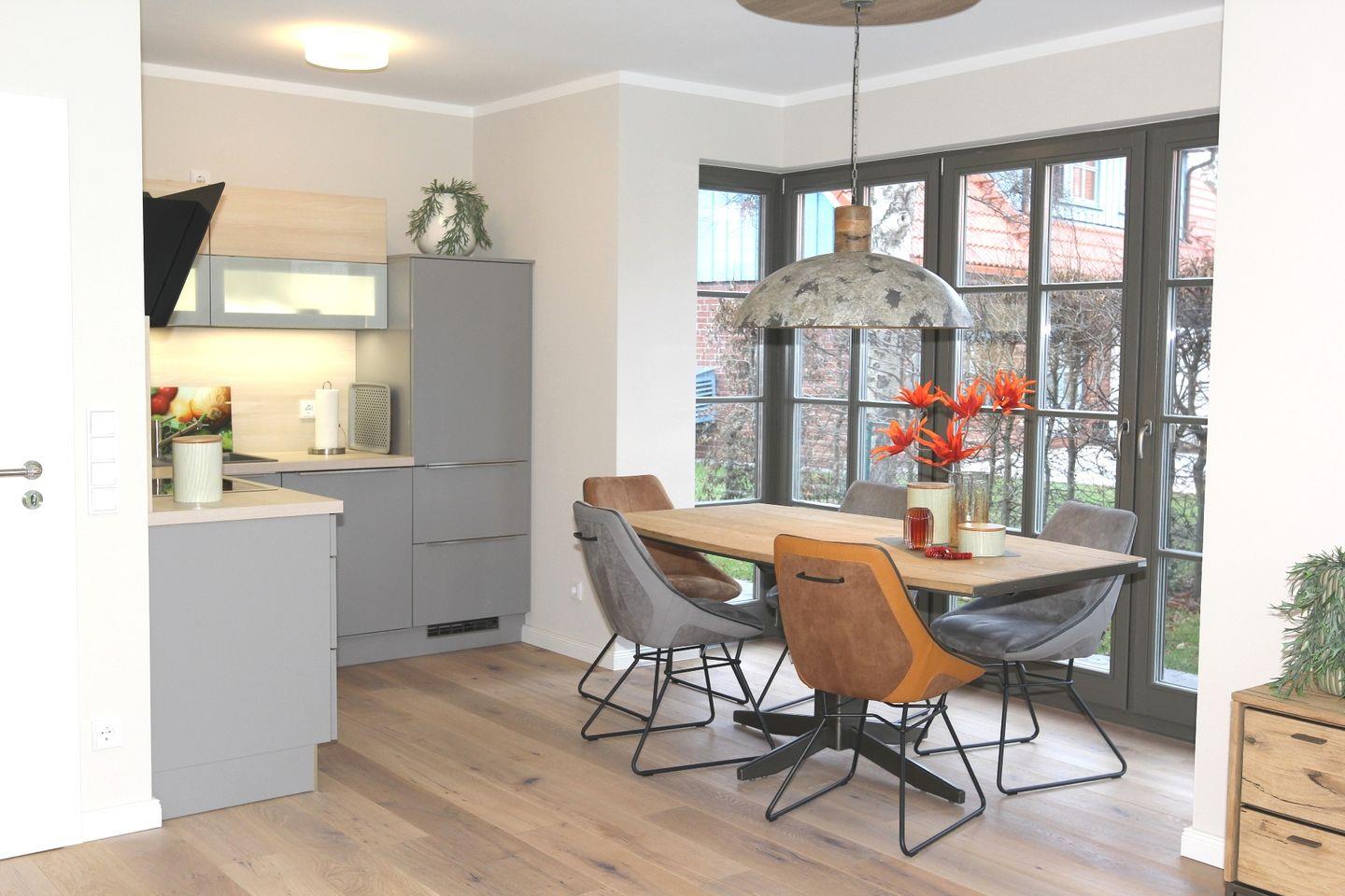 Ins Haus getreten empfängt Sie ein Flur, von dem links ein Duschbad und rechts der Wirtschaftsraum abgehen. Geradeaus betreten Sie das großzügige Wohn-Esszimmer mit der modernen Küchenzeile. Die bodentiefen Fenster sorgen für viel Licht und einen schönen Blick auf die Terrasse.
