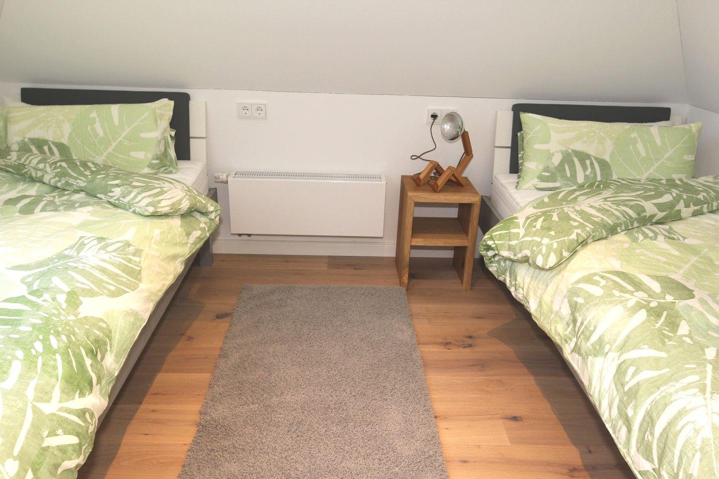 Im Spitzboden gibt es ein weiteres Schlafzimmer mit zwei Betten.