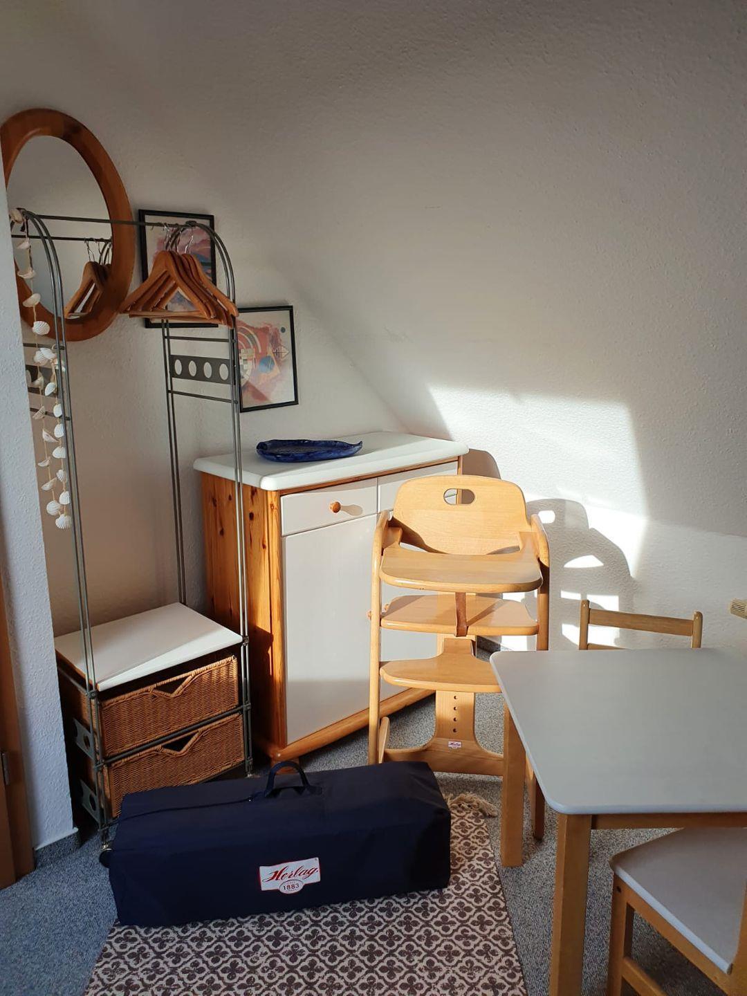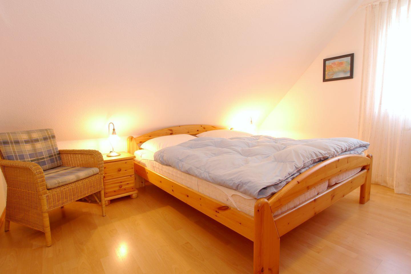 Die 50 m² große Maisonettewohnung kann mit maximal 4 Erwachsenen belegt werden. In den Wohnraum sind Küche und Essecke integriert, von hier gelangt man auch auf den Südbalkon. Ein Schlafzimmer mit Doppelbett (1,80m x 2,00m) und das Badezimmer mit Dusche befinden sich auf der Wohnebene, ebenso wie ein kleiner Hauswirtschaftsraum vor der Wohnung in dem die Münzwaschmaschine zu finden ist. Im Dachgeschoss befindet sich dann das zweite Schlafzimmer mit zwei einzelnen Betten.