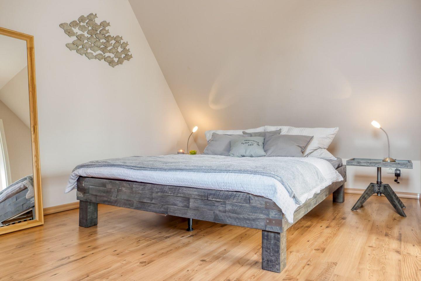 Die 58 qm große Maisonettewohnung wird für bis zu 2 Personen vermietet und liegt in der 1. Etage. Über einen kleinen Flur gelangt man in den Wohnbereich mit Kaminofen, der voll ausgestatteten integrierten Küche und Zugang zum großen Westbalkon. Auch das Badezimmer mit Dusche und WC befindet sich auf dieser Etage. Das geräumige Schlafzimmer mit Ehebett erreichen Sie über eine Wendeltreppe im Wohnbereich, hier schließt sich dann auch noch ein kleines Fernsehzimmer mit Relaxliege und zweitem Flachbildfernseher an.