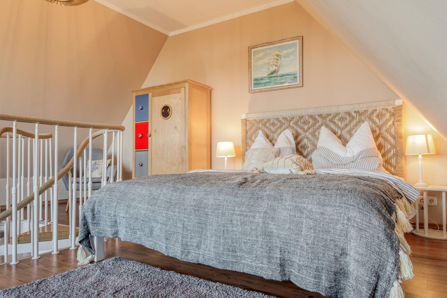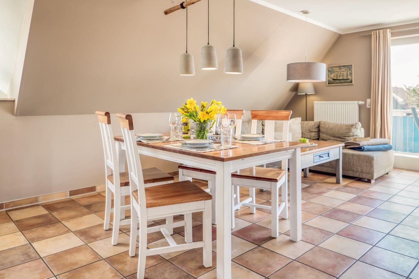 Die 85 m² große Maisonettewohnung wird für 4 Personen vermietet. Im hellen Wohnraum ist die vollausgestattete Küche integriert, hier gelangen Sie auch auf den großen Westbalkon. Auf der Wohnebene befindet sich ein Schlafzimmer mit Ehebett sowie 2 Bäder mit Dusche, im größeren ist eine Sauna (gegen Gebühr) zu finden. Vom Flur führt eine Treppe zum zweiten Schlafzimmer im Dachgeschoss, dieses ist mit einem Ehebett ausgestattet. Hier finden Sie auch ein kleines, zusätzliches Sofa und den zweiten Fernseher.