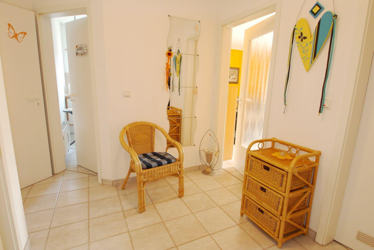 Die 57 m² große Erdgeschosswohnung wird für bis zu 2 Erwachsene und 2 Kinder vermietet. Das Wohnzimmer ist gemütlich mit warmen Farben eingerichtet, eine Westterrasse mit Zugang zum Fahrradraum schließt sich an. Die Wohnung verfügt über eine separate Küche und ein Badezimmer mit einer Badewanne, die auch zum Duschen genutzt werden kann. Im größeren Schlafzimmer befindet sich ein Doppelbett und im kleineren ist ein Ausziehbett, mit einer weiteren niedrigeren Liegefläche, vorhanden.