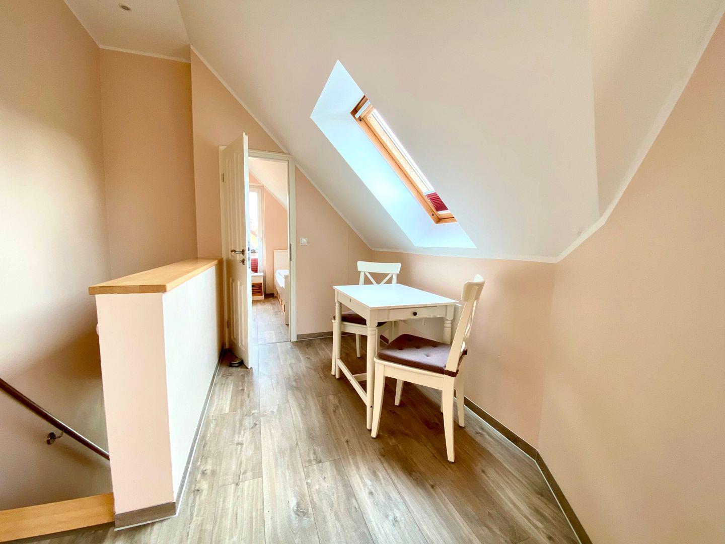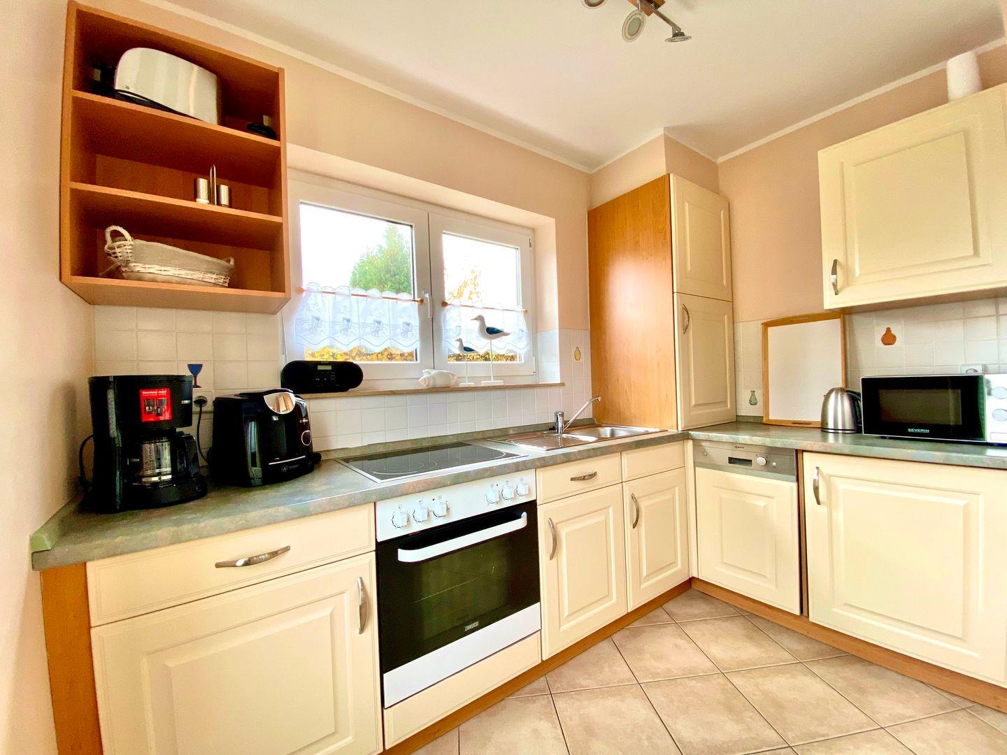 Die ca. 65 m² große Ferienwohnung befindet sich in einer Doppelhaushälfte und wird für maximal 2 Erwachsene + 2 Kinder vermietet. Sie verfügt im Erdgeschoss über ein Wohnzimmer (TV, Radio), integrierte Küche (Umluftherd mit Ceranfeld, Kaffeemaschine, Mikrowelle, Wasserkocher, Toaster, Kühlschrank, Spülmaschine) sowie ein Bad (WC/Dusche) mit Fußbodenheizung und Handtuchheizkörper. Im 1.OG befinden sich 2 Schlafzimmer (1 Ehebett / 2 einzelne Betten).