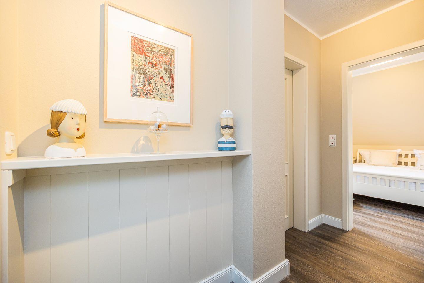 Im Erdgeschoss befinden sich der Wohn-Essbereich mit integrierter Küche und der Zugang zur Terrasse. Im 1. Obergeschoss ist ein Schlafzimmer mit Ehebett und das Bad mit Eckbadewanne, Dusche und WC. Im Dachgeschoss ein weiteres Schlafzimmer mit 2 Einzelbetten.