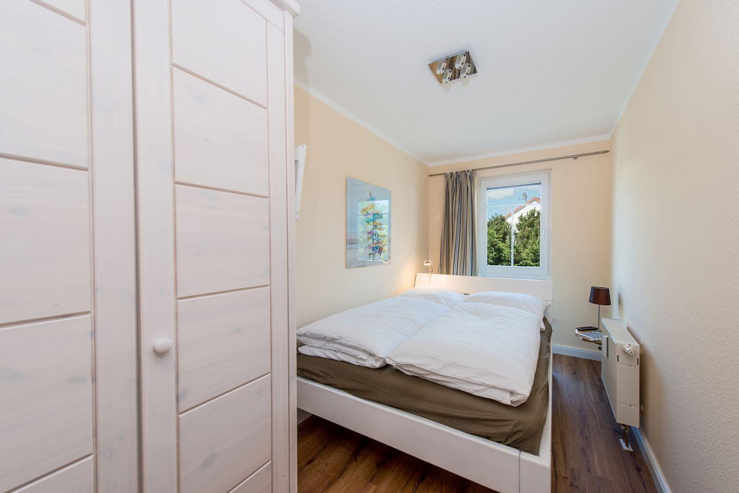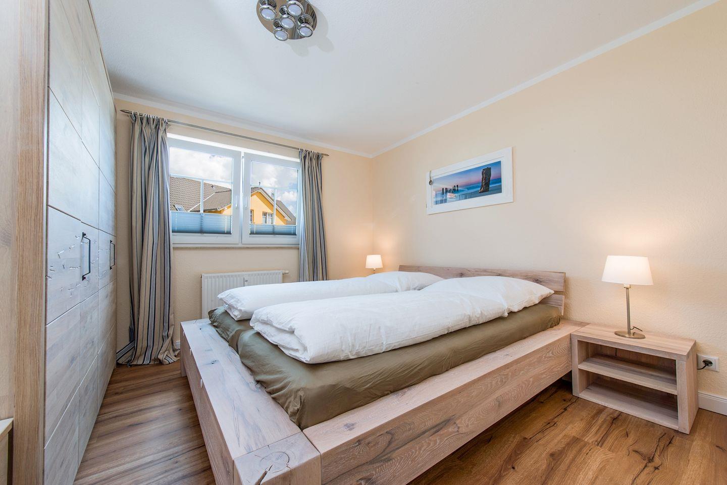 Die 64 qm große Wohnung liegt in der 1. Etage und kann mit bis zu 4 Personen angemietet werden. Die Wohnung verfügt über einen Westbalkon und einen großzügigen Wohnbereich mit Essecke, der in die offene Küche übergeht. Eines der Schlafzimmer ist mit einem Doppelbett ausgestattet, das andere mit einem 1,40 m breiten französischen Bett. Beide Zimmer verfügen über einen zusätzlichen Fernseher. Die Fenster sind mit Fliegengittern versehen und für die Fahrräder steht ein Fahrradschuppen zur Verfügung.