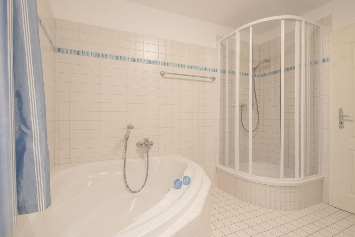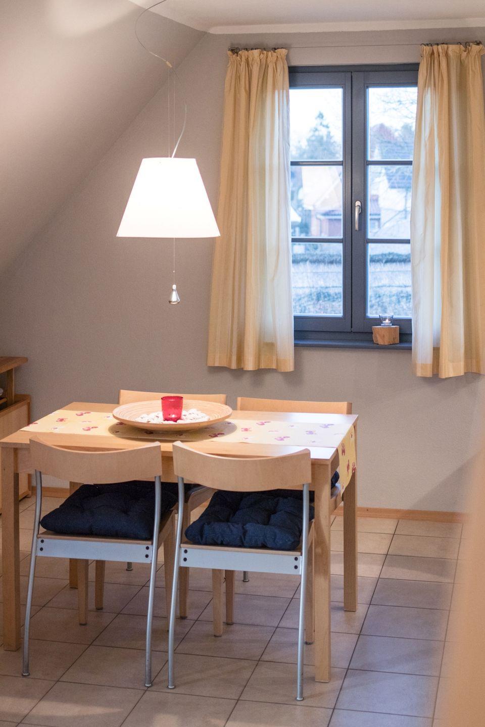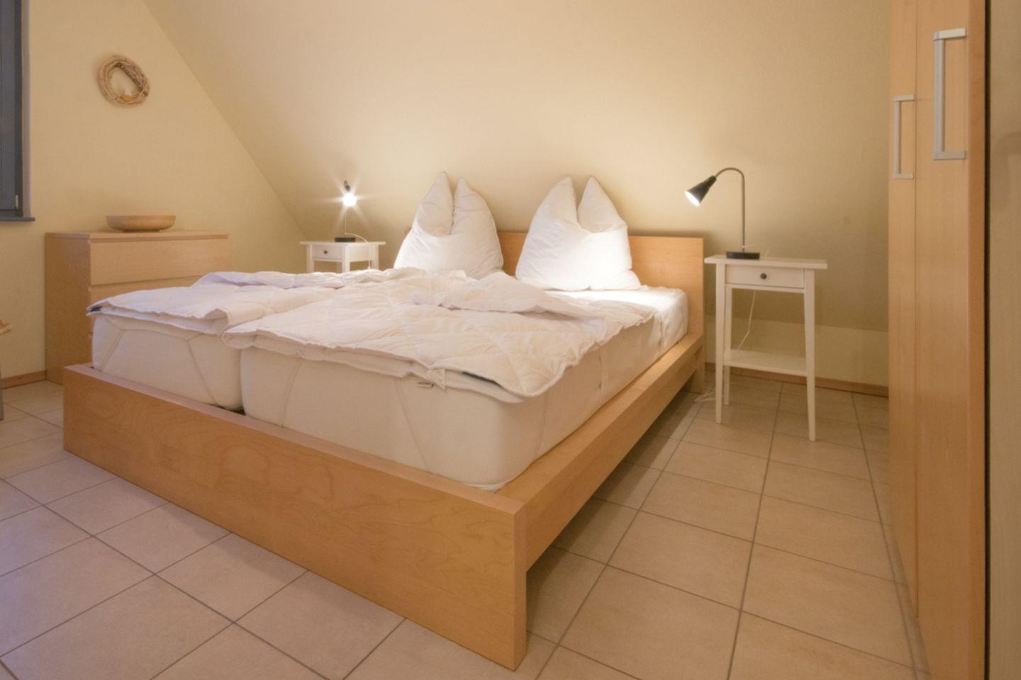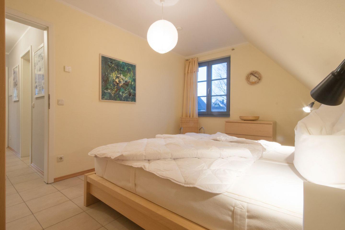 Die 50 m² große Obergeschosswohnung wird für 2-3 Personen vermietet und befindet sich in der 1. Etage. Im Wohnzimmer mit Essecke und integrierter Küchenzeile ist eine Schlafcouch für eine Person zu finden, der Zugang zum möblierten Westbalkon erfolgt ebenfalls von hier. Das Schlafzimmer ist mit einem Doppelbett ausgestattet, im geräumigen Badezimmer sind eine Dusche und eine Eckbadewanne untergebracht. Ein kleines Gartenhäuschen steht für Fahrräder zur Verfügung.