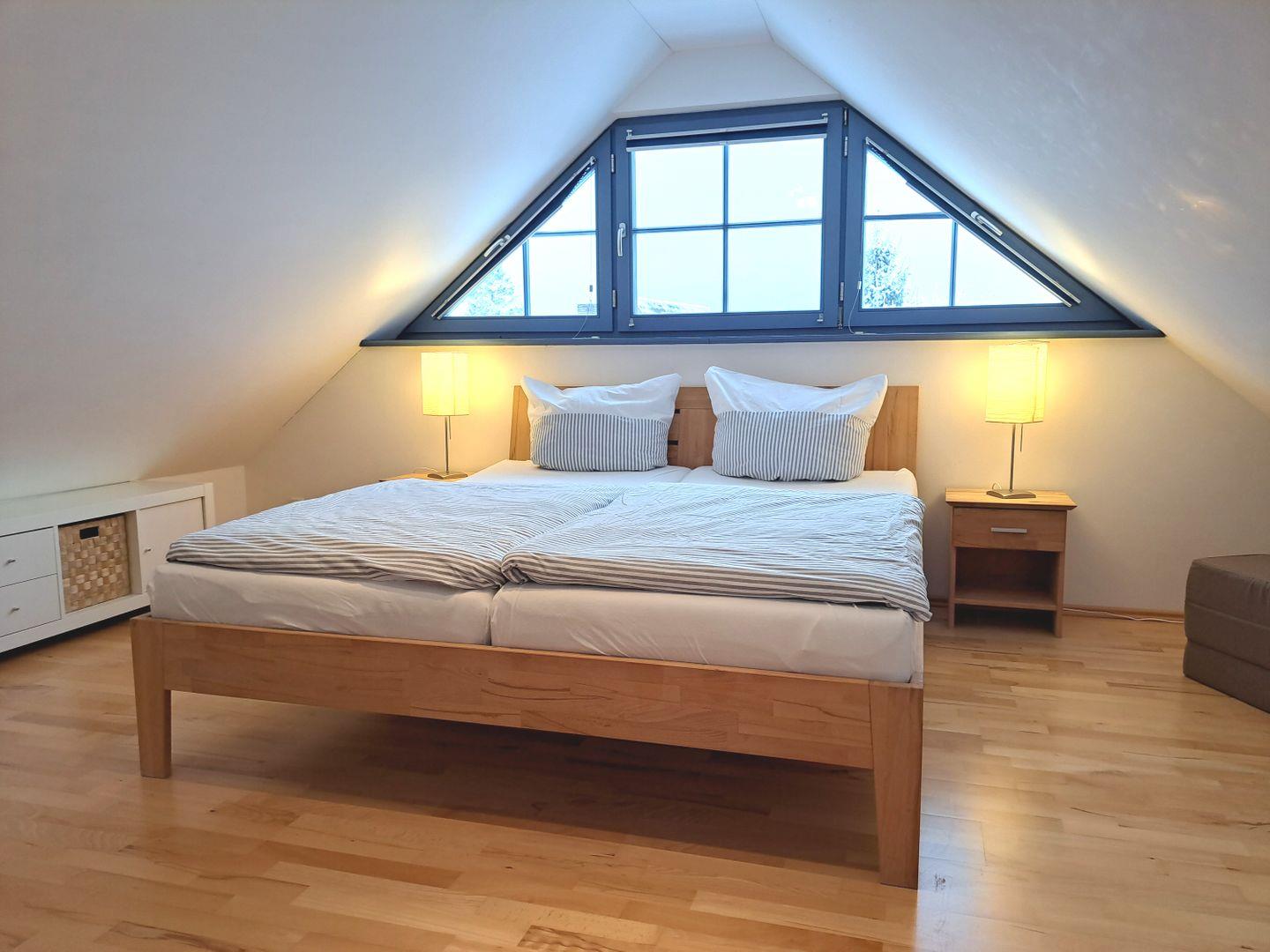 Die 85 m² große Maisonettewohnung befindet sich im 1. OG und wird für bis zu 4 Erwachsene vermietet. Der große Wohnraum mit Kaminofen schliesst auch die Essecke und die hochwertig ausgestattete Küche ein, der Zugang zum Balkon erfolgt ebenfalls von hier. Im unteren Bereich der Wohnung finden Sie ein Schlafzimmer mit einem Doppelbett sowie ein großzügiges Bad mit Dusche und WC. Über eine Holztreppe gelangen Sie in die obere Etage. Hier stehen Ihnen dann ein weiteres Schlafzimmer mit Doppelbett und ein Gäste-WC zur Verfügung.
