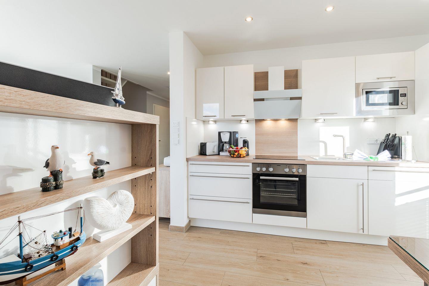 Im Obergeschoss befindet sich das große Wohnzimmer mit der integrierter Küche. Ein helles und gemütliches Schlafzimmer mit Boxspringbetten (180x215) laden zum Entspannen ein. Das Badezimmer, bodengleicher Dusche, befindet sich ebenfalls in dieser Etage. Der große Balkon mit der Ausrichtung nach Südwesten zur untergehenden Sonne geht direkt vom Wohnzimmer ab.