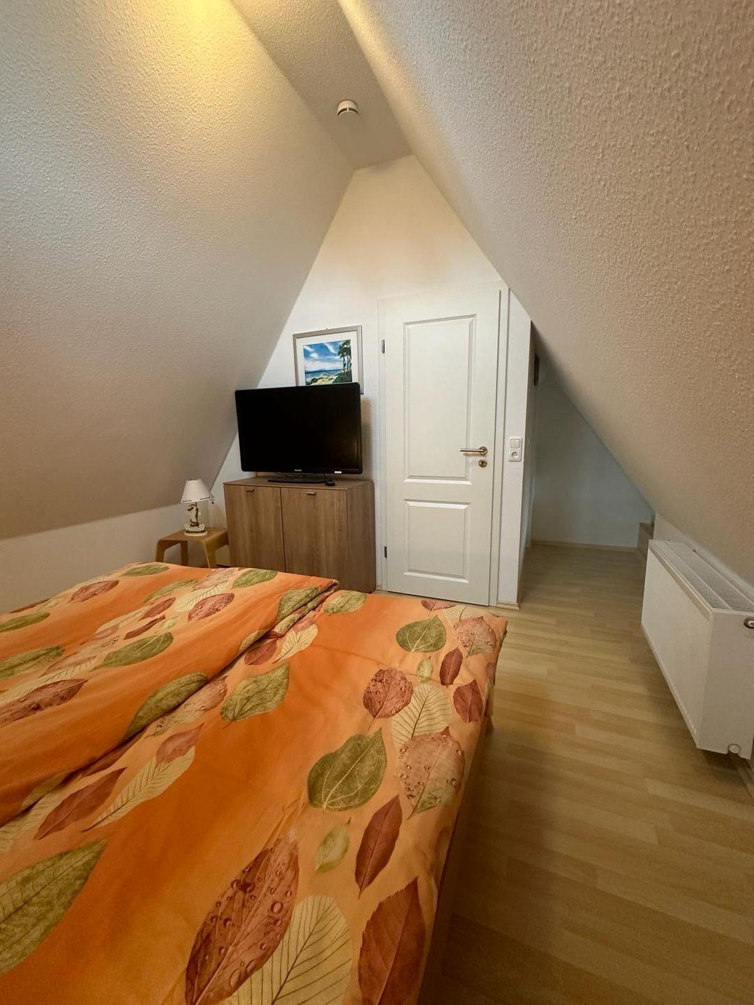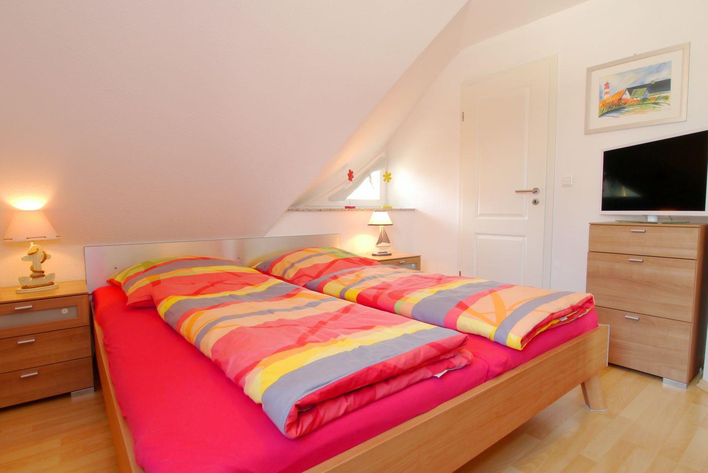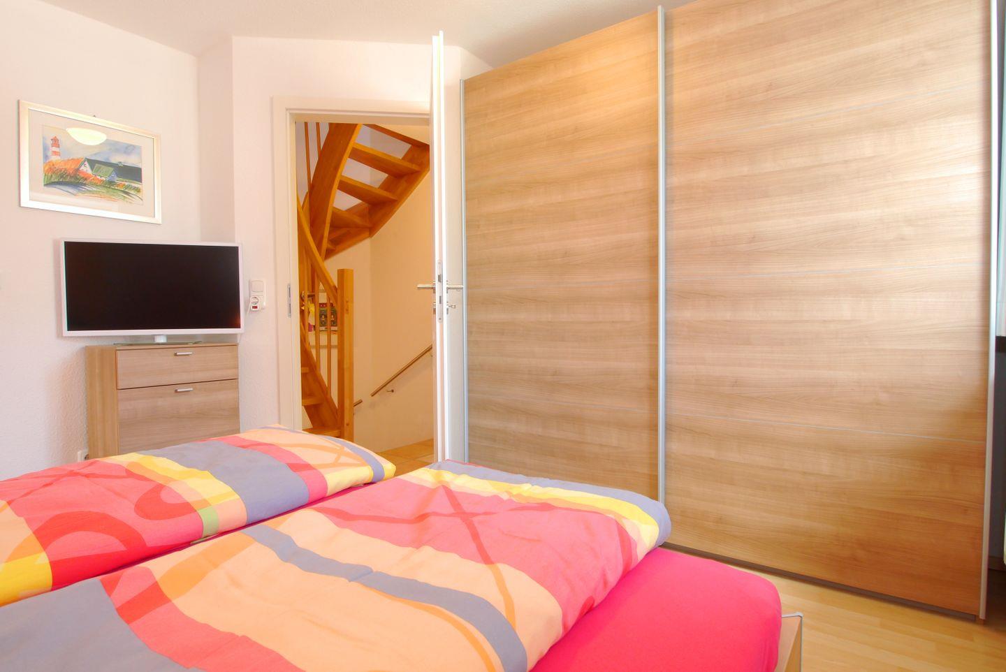 Im Erdgeschoss ist der Wohnbereich mit dem schönen Kamin, integrierter Küche, Essecke und Zugang zur Westterrasse sowie ein Gäste-WC. Auf der 1. Etage sind zwei Schlafzimmer (einmal mit Ehebett und einmal mit einem Einzelbett und einer Schlafcouch) sowie zwei Bäder jeweils mit Dusche und WC. Im 2. OG ist auf der offenen Galerie ein weiteres abgetrenntes Schlafzimmer mit einem Doppelbett 180x200cm. Sämtliche Schlafzimmer sind jeweils mit einem Fernsehgerät ausgestattet. Zum Haus gehört ein Parkplatz im Carport. Ein Fahrradschuppen steht Ihnen ebenfalls zur Verfügung. Das Grundstück ist durch einen Friesenwall und einem Zaun befriedet.