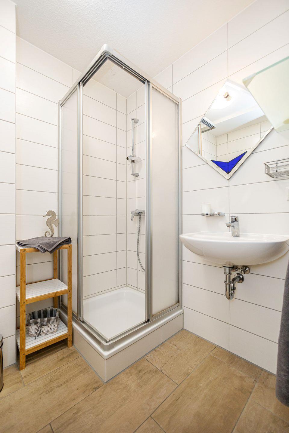 Die 70 m² große Erdgeschoßwohnung kann mit 2 Erwachsenen und 2 Kindern angemietet werden. Der Eingangsbereich mit Garderobe geht in die Küche über, von hier gelangt man durch eine Glastür in den Wohnbereich mit Essecke und Zugang zur Westterrasse. Eines der Schlafzimmer ist mit einem Doppelbett ausgestattet, im kleineren Schlafzimmer gibt es eine Schlafcouch für zwei Personen und einen zweiten Fernseher. Das Badezimmer verfügt über eine Dusche und im Innenhof ist ein Gemeinschaftsfahrradschuppen zu finden.