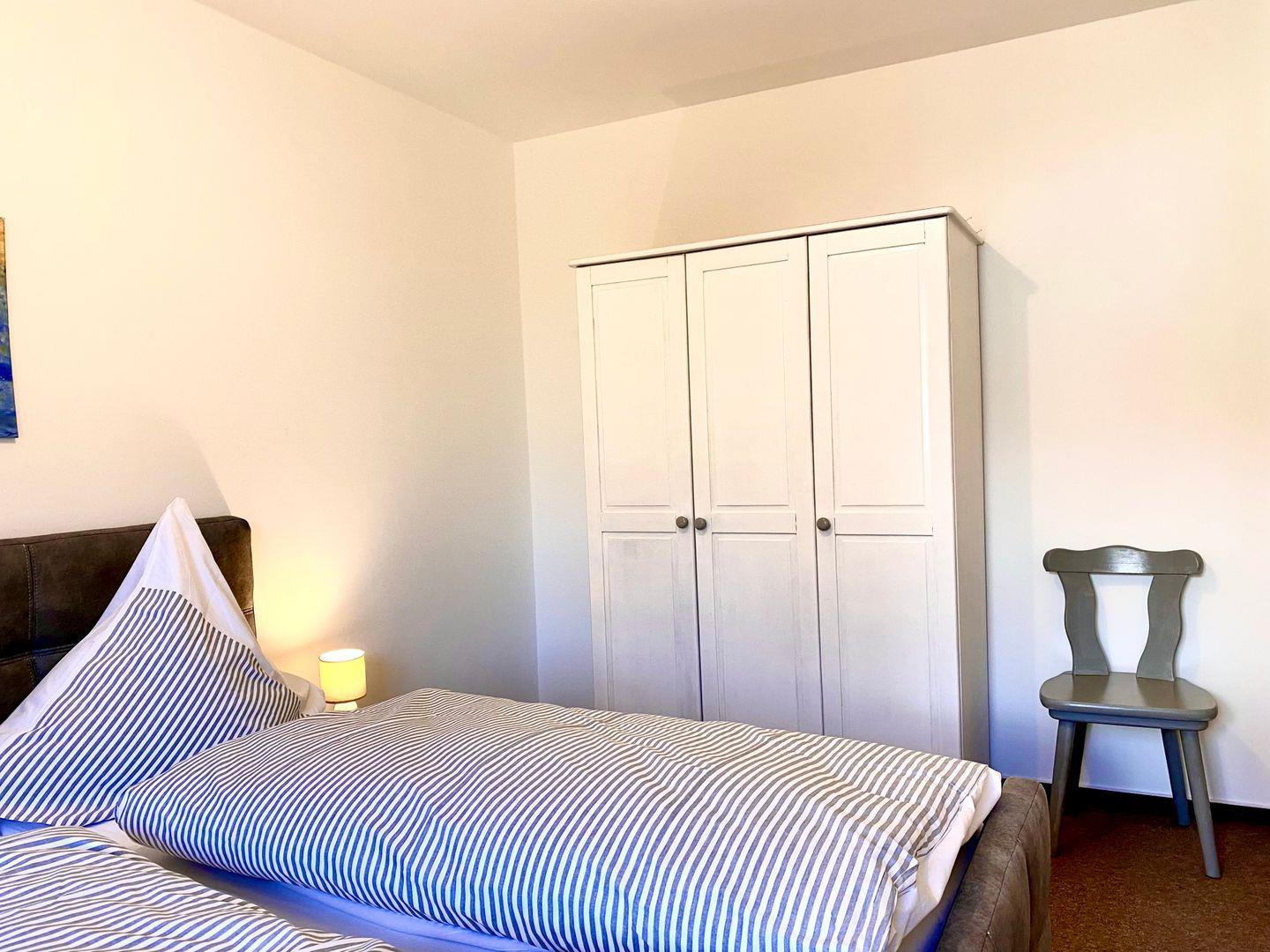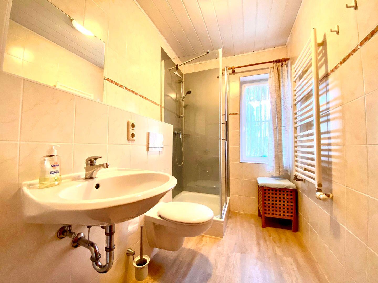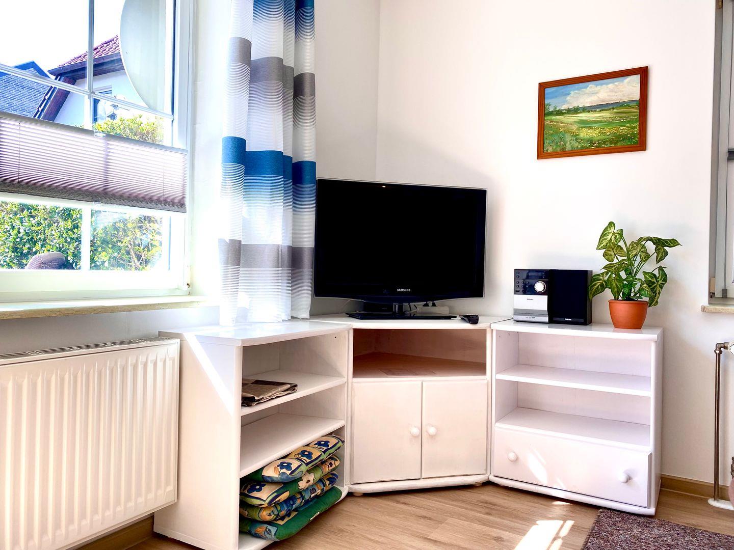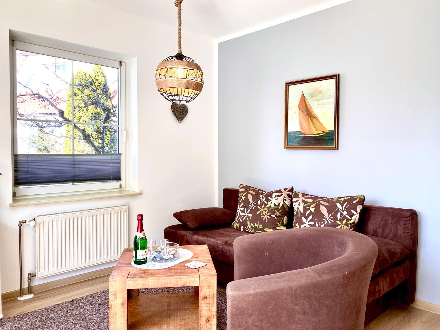 In einem schönen Garten befindet sich das Haus Windrose mit der Fewo "Westwind". Diese ca. 45 qm große Ferienwohnung liegt im Erdgeschoss und wird für maximal zwei Erwachsene und ein Kind angeboten. Im Wohnzimmer befinden sich eine integrierte Küche und eine Essecke. Von hier gelangen Sie auf eine große Terrasse, die nach Süden ausgerichtet ist. Ihnen steht ein Schlafzimmer mit Doppelbett und eine Schlafcouch im Wohnzimmer zur Verfügung. Das Bad hat ein Fenster und ist mit einer neuen Glasdusche und WC sowie Handtuchtrockner ausgestattet. In der Küche befindet sich eine Mikrowelle mit Grill und Backfunktion. In der Fewo ist in jedem Zimmer mindestens ein Fenster mit Fliegengitter vorhanden.